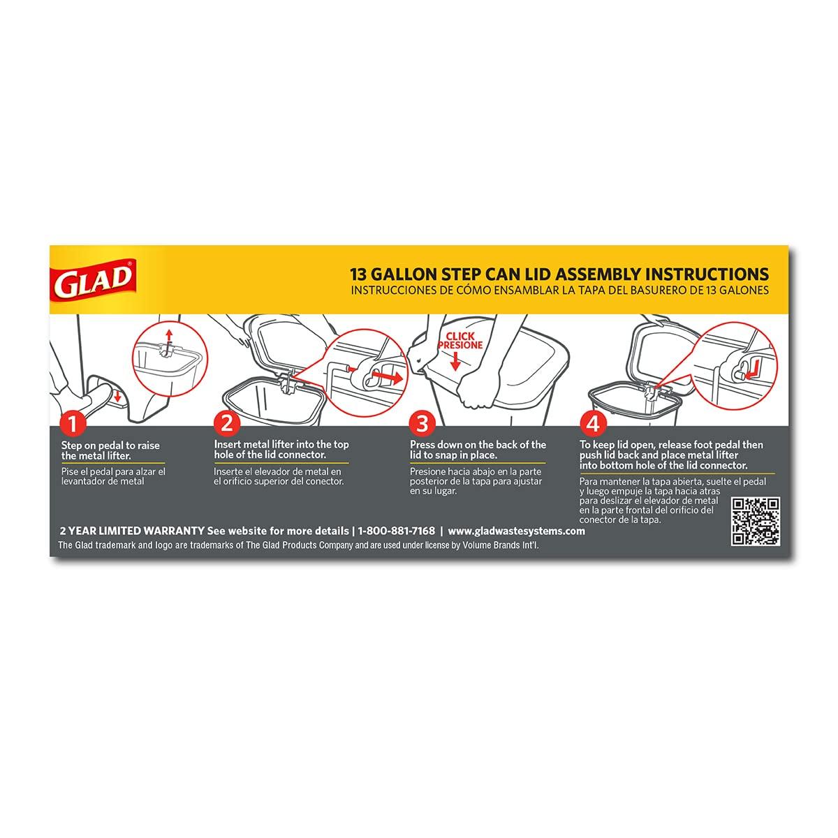Glad Plastic Step Trash Can offers CloroxTM protection of the lid and lid frame to block odors for the life of the can. The interior bag rings hold the trash bag securely in place so you don't need to worry about showing excess bag out of your elegant trash can. It also prevents the bag from falling in. The 50 liter capacity makes this 13 gallon trash can is ideal for kitchens, commercial offices, and families. Designed with a convenient food pedal for hands-free operation. Package contains two plastic garbage bins in a white finish. Each plastic waste bin measures 18 inches wide, 14.7 inches deep, and 25 inches high.
