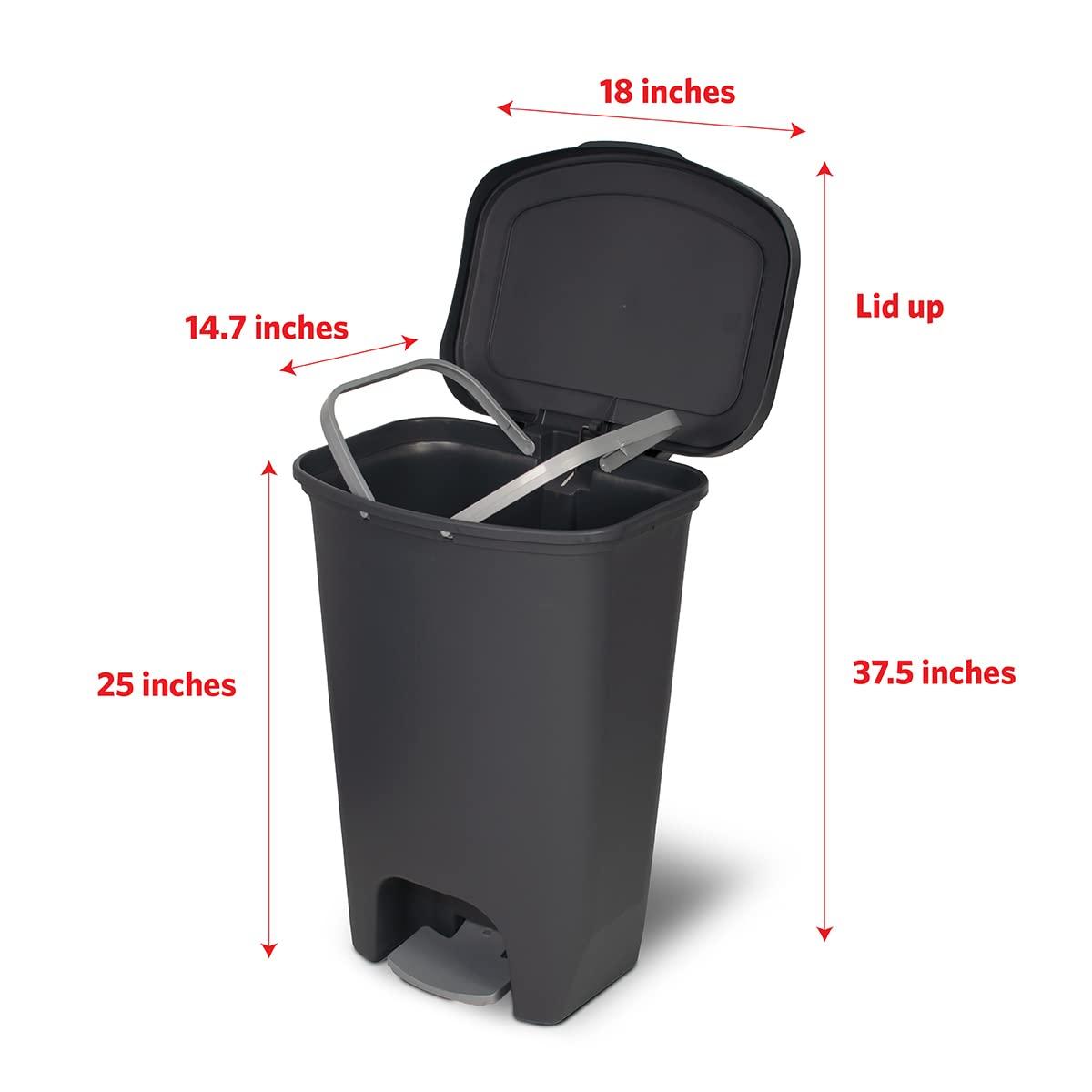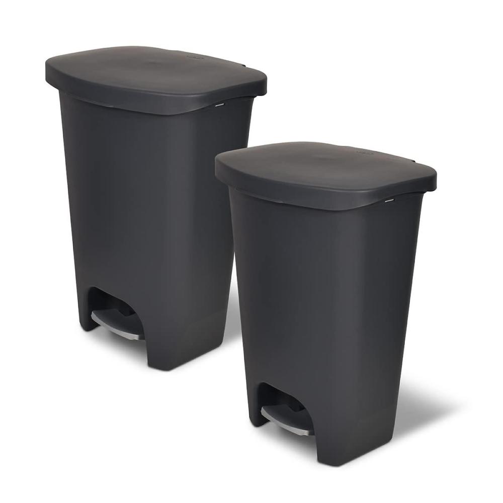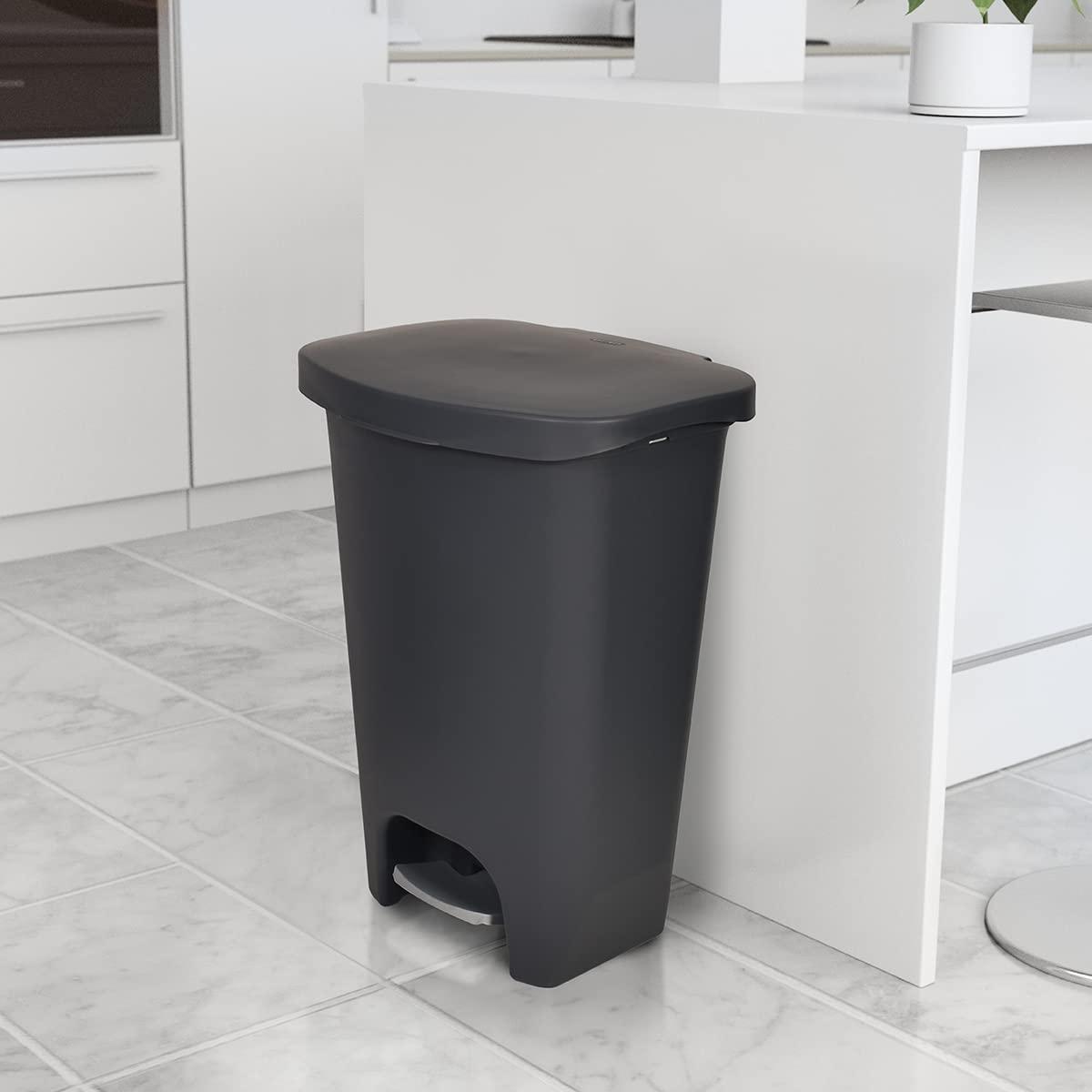 PLASTIC TRASH CAN WITH STEP PEDAL – This kitchen trash can with lid is designed with a foot pedal for hands-free operation. It allows you to throw your trash without having to lift the lid of the can.