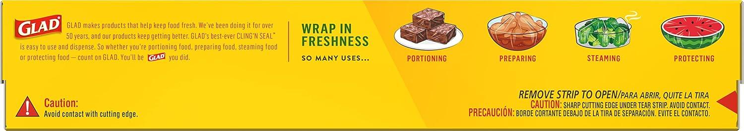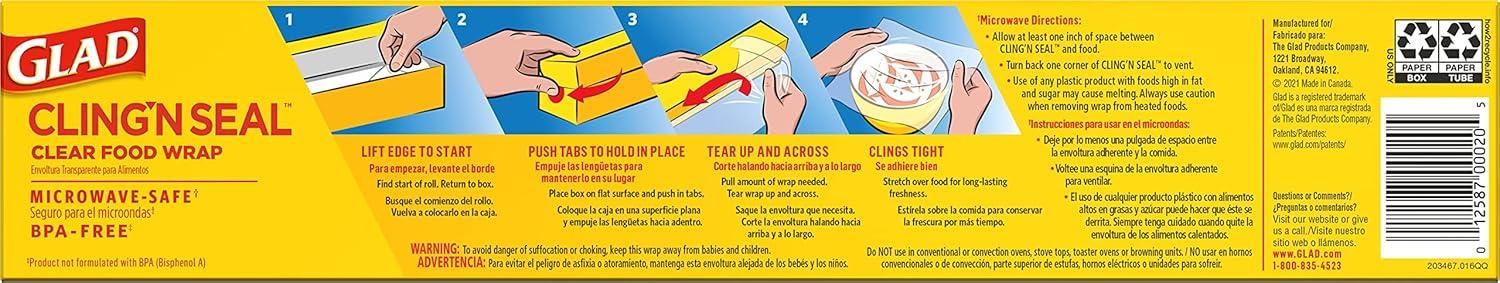 Glad Cling N Seal gives you 2X Freshness Protection with an airtight seal and moisture block technology. Glad Cling N Seal extends your foods freshness by keeping air out with a superior seal cling versus the national brand, keeping your foods fresher longer based on moisture loss in produce versus no protection. Its easy to use roll makes protecting your favorite foods fast and simple. This food wrap is easy to handle and grips to a variety of surfaces, such as glass and metal, making it useful for portioning, preparing, steaming and protecting. Cling N Seal can be used outside of the kitchen too. It is great to use for preventing leaks in toiletries when traveling, wrapping wet paint brushes to use later, or keeping items in drawers when moving. Glad Cling N Seal is made without BPA and is microwave safe. Glad protects and seals with ease.