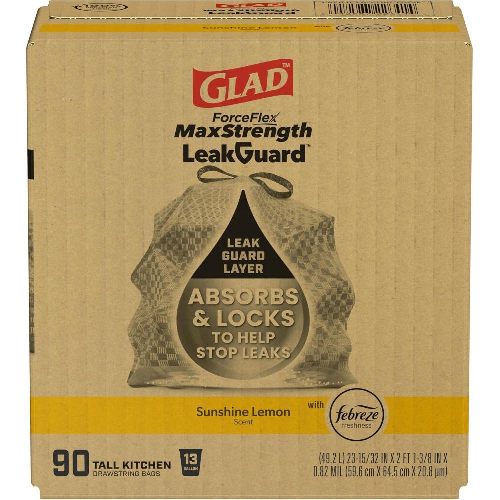 Introducing a trash bag technology so game changing, you have to see it to believe it. The Glad ForceFlex MaxStrength LeakGuard Tall Kitchen Drawstring Trash Bag is the first kitchen trash bag with liquid locking technology to absorb most liquids for up to 100% leak protection. Designed with an innovative LeakGuard layer that absorbs and locks most liquids such as water, coffee, juice and more, helping you avoid drippy trash disasters. Double side seams, ForceFlex MaxStrength technology and a grips the can drawstring add up to a dependable trash bag you can trust no leaks, no second guessing. Glads 3 in 1 OdorShield traps, locks and neutralizes odors, leaving behind a steady release Sunshine Lemon scent with Febreze Freshness to deliver long lasting odor control. Get a handle on trash with Glad.