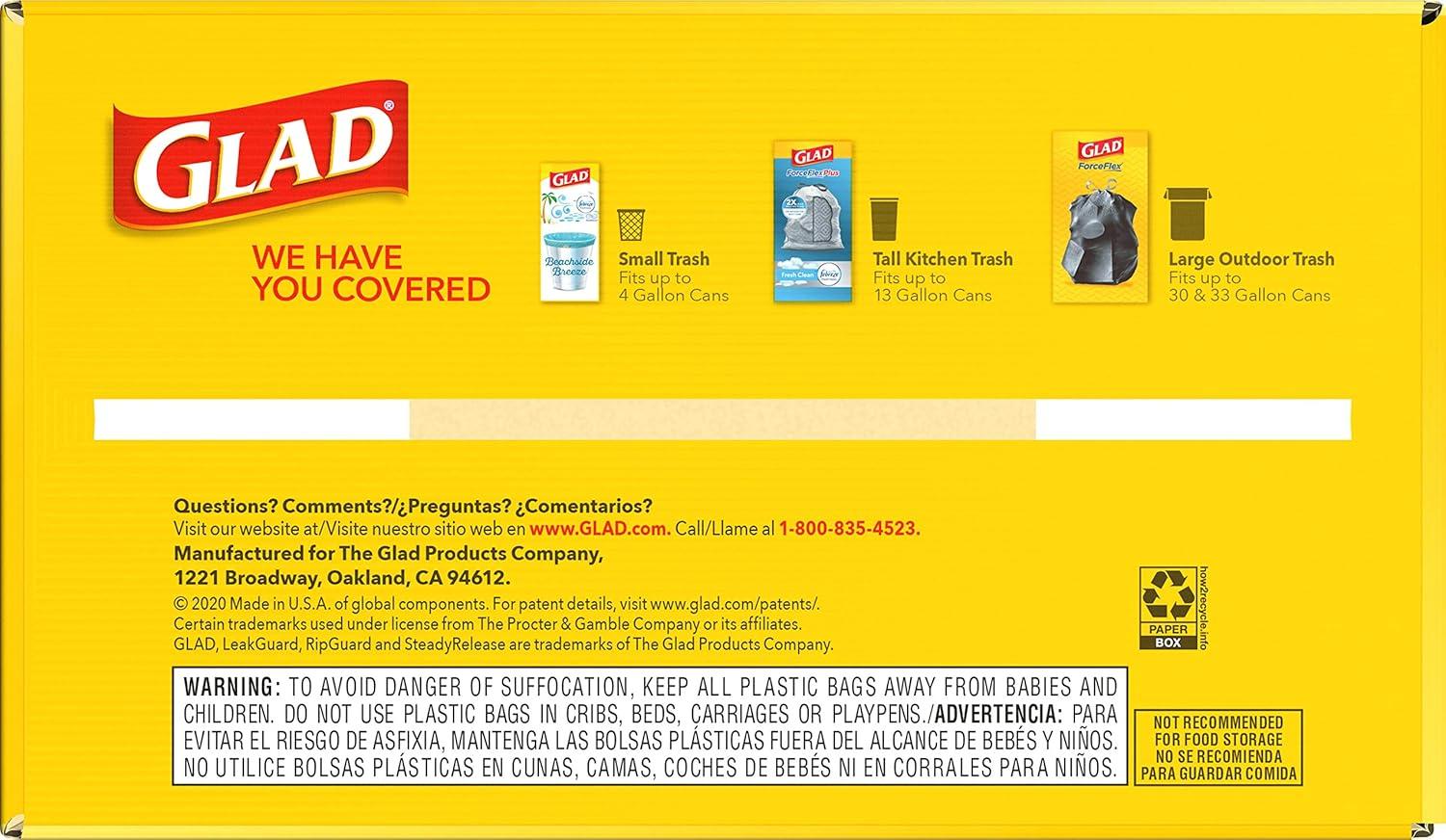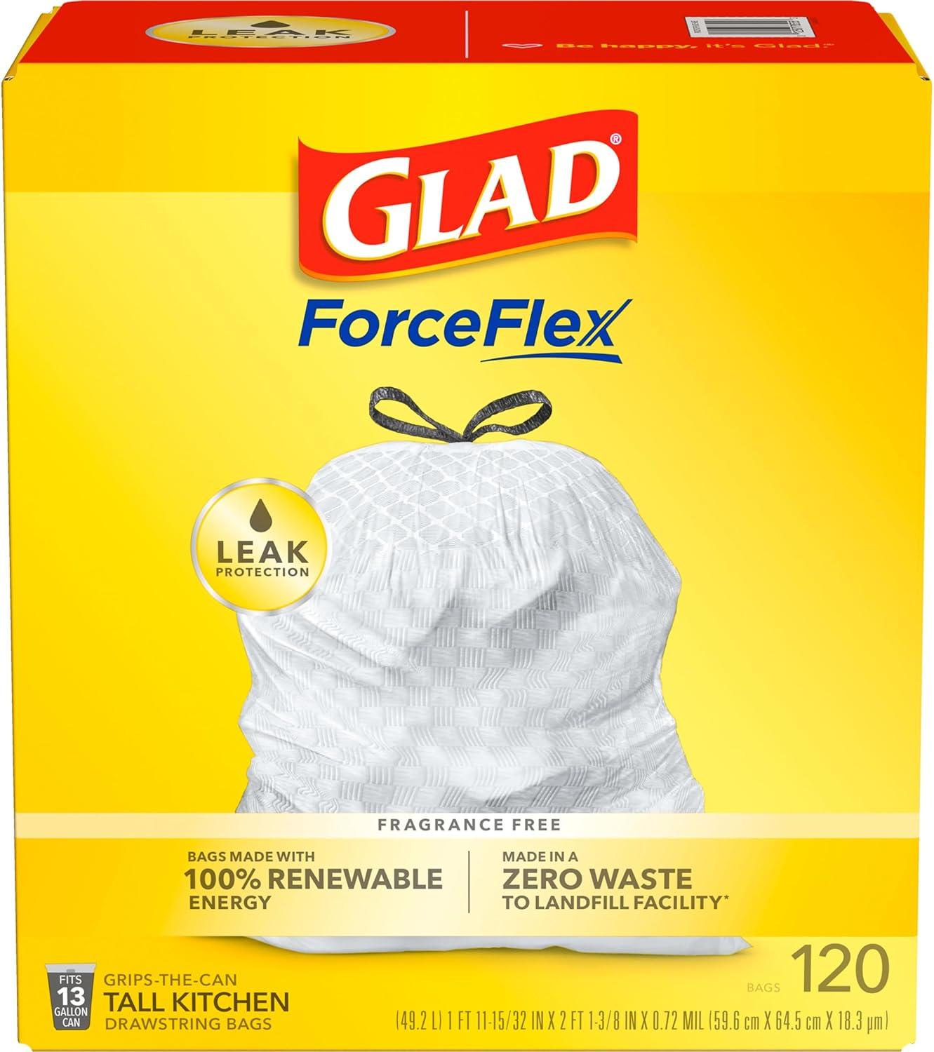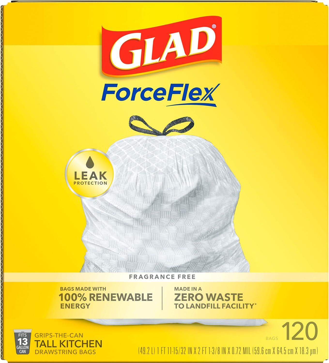 13 GALLON PLASTIC TRASH BAGS: Avoid messy kitchen disasters with Glad Tall Kitchen Drawstring Trash bags, designed with stretchable strength to handle the heaviest kitchen loads without tearing