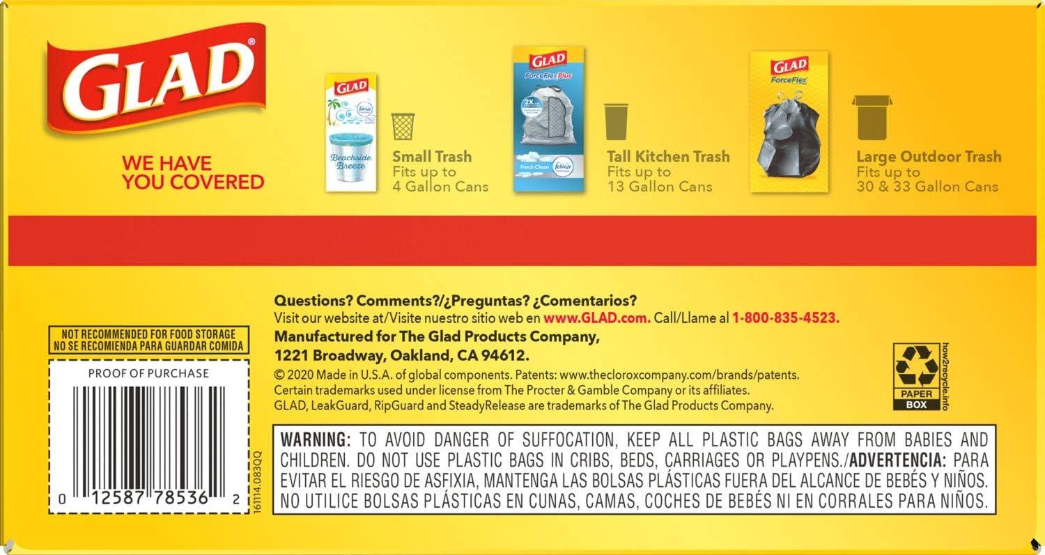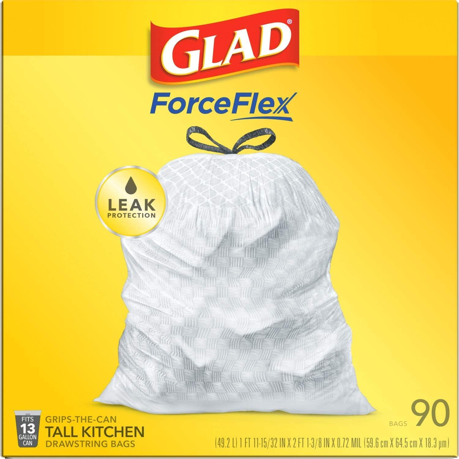 13 GALLON PLASTIC TRASH BAGS: Avoid messy kitchen disasters with Glad Tall Kitchen Drawstring Trash bags, designed with stretchable strength to handle the heaviest kitchen loads without tearing