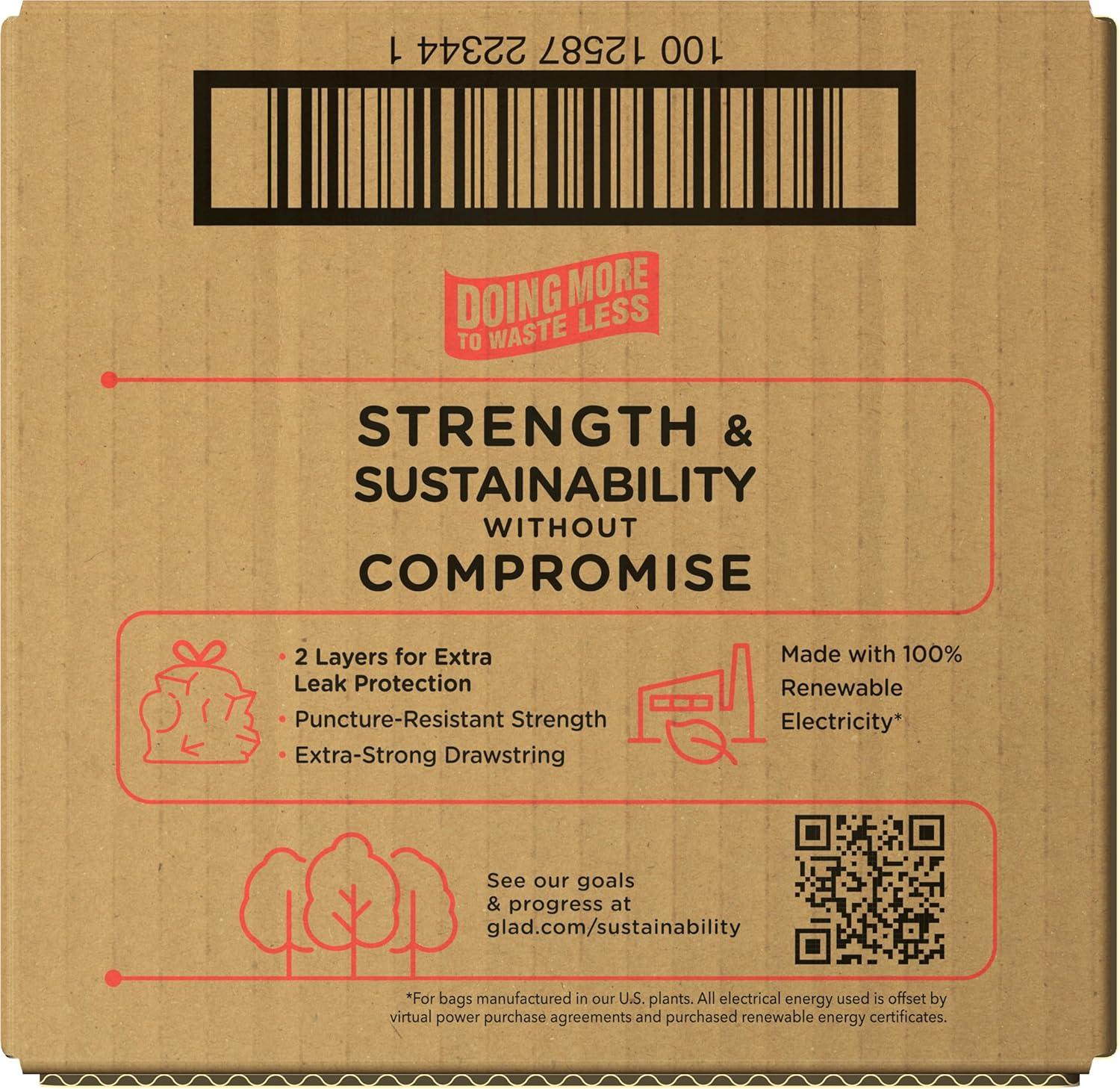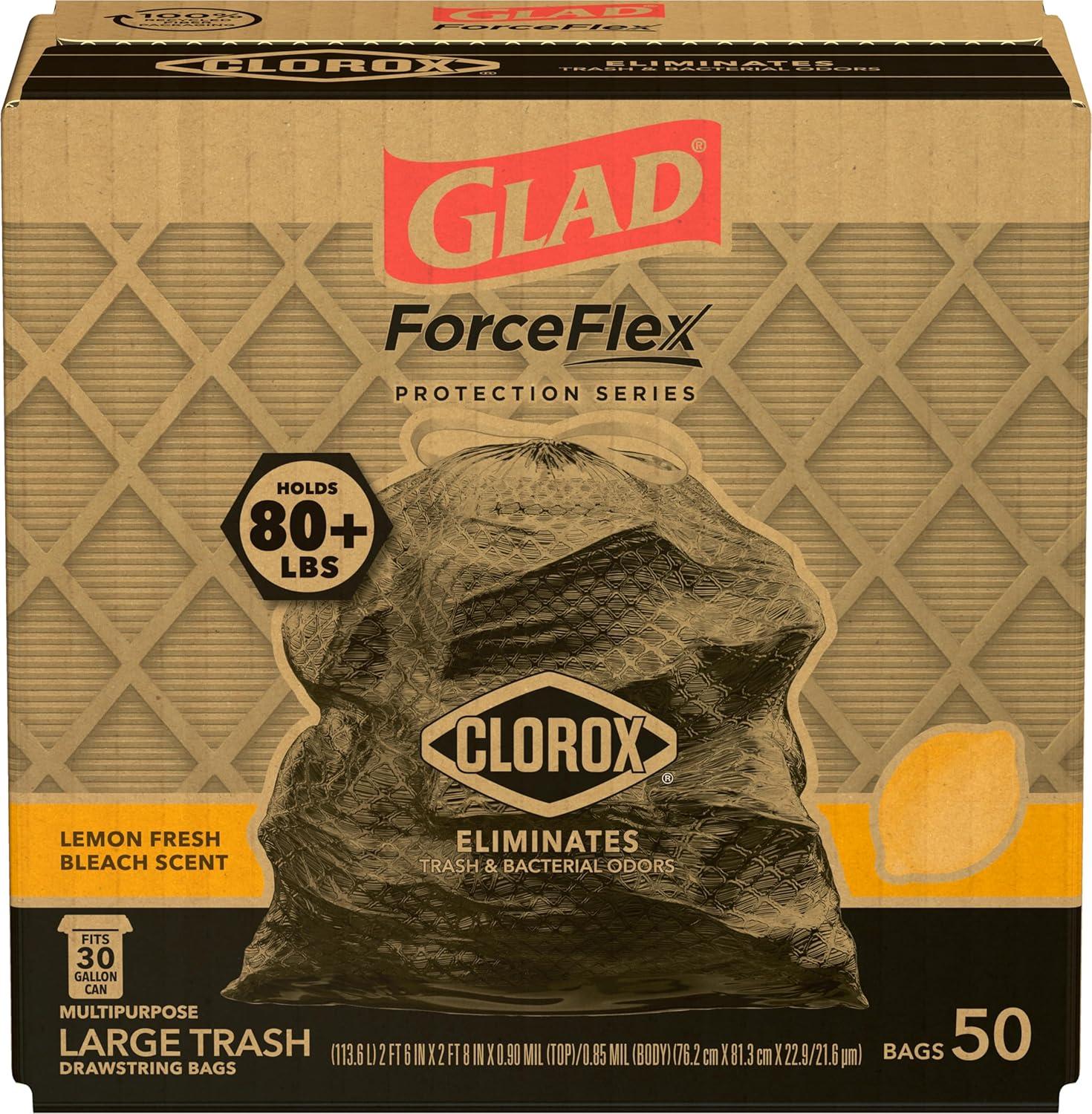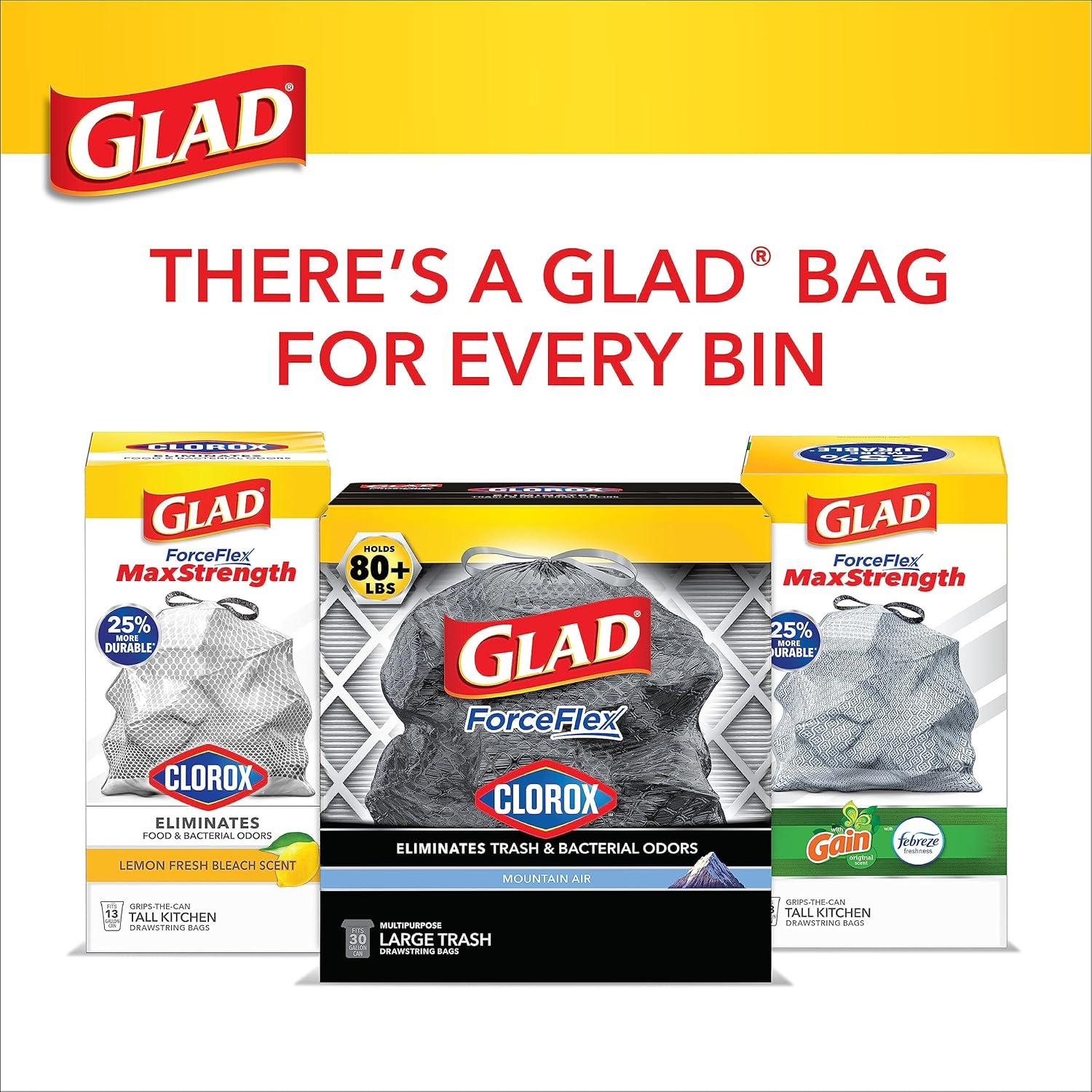 Keep your garbage contained and eliminate trash and bacterial odors with Glad ForceFlex Drawstring Large Trash Bags with the odor-fighting power of Clorox. Featuring the clean scent of Mountain Air, these scented garbage bags help keep your space smelling fresh. With stretchable strength and advanced RipGuard and LeakGuard protection, these heavy-duty ForceFlex trash bags resist punctures, rips, tears and the seepage of liquids. Each bag holds 80+ pounds to handle your biggest trash loads without messy trash disasters. The sturdy drawstring grips the trash can to keep the large black trash bags in place, and it closes with a quick cinch when the garbage bag is full. Once closed, the drawstring keeps the trash securely inside the bag, letting you confidently transport it to the curb without frustration or fear of leaks and tears. Each of these scented trash bags measures 2 feet 6 inches by 2 feet 8 inches, making it just the right size for large outdoor garbage cans. Use these drawstring trash bags for any large project, whether you're moving, cleaning out the garage or tackling a demanding outdoor cleanup job. It's better than all good. Its all Glad.