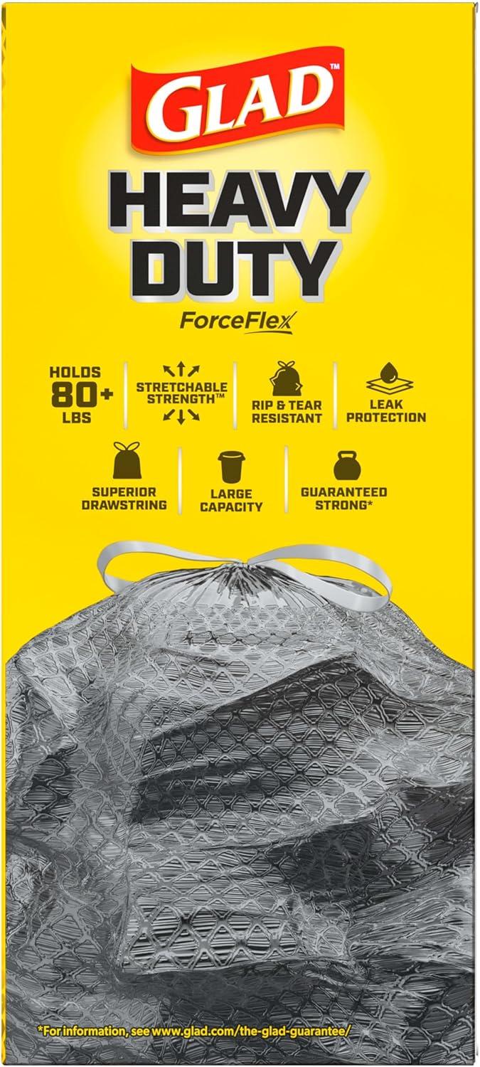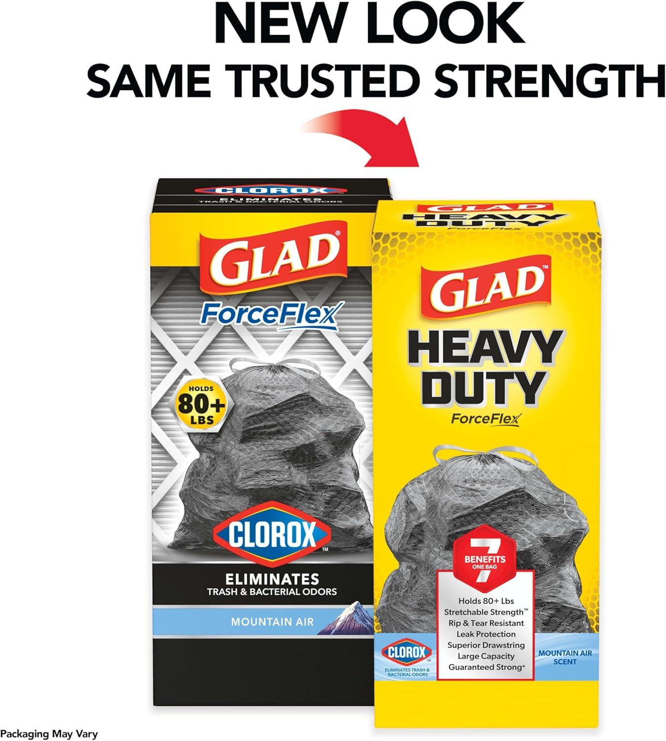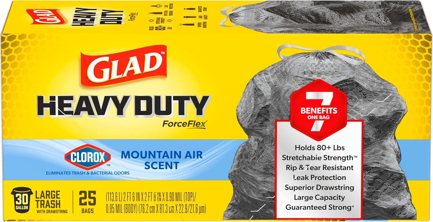 Keep your garbage contained and eliminate trash and bacterial odors with Glad ForceFlex Drawstring Large Trash Bags with the odor-fighting power of Clorox. Featuring the clean scent of Mountain Air, these scented garbage bags help keep your space smelling fresh. With stretchable strength and advanced RipGuard and LeakGuard protection, these heavy-duty ForceFlex trash bags resist punctures, rips, tears and the seepage of liquids. Each bag holds 80+ pounds to handle your biggest trash loads without messy trash disasters. The sturdy drawstring grips the trash can to keep the large black trash bags in place, and it closes with a quick cinch when the garbage bag is full. Once closed, the drawstring keeps the trash securely inside the bag, letting you confidently transport it to the curb without frustration or fear of leaks and tears. Each of these scented trash bags measures 2 feet 6 inches by 2 feet 8 inches, making it just the right size for large outdoor garbage cans. Use these drawstring trash bags for any large project, whether you're moving, cleaning out the garage or tackling a demanding outdoor cleanup job. It's better than all good. Its all Glad.