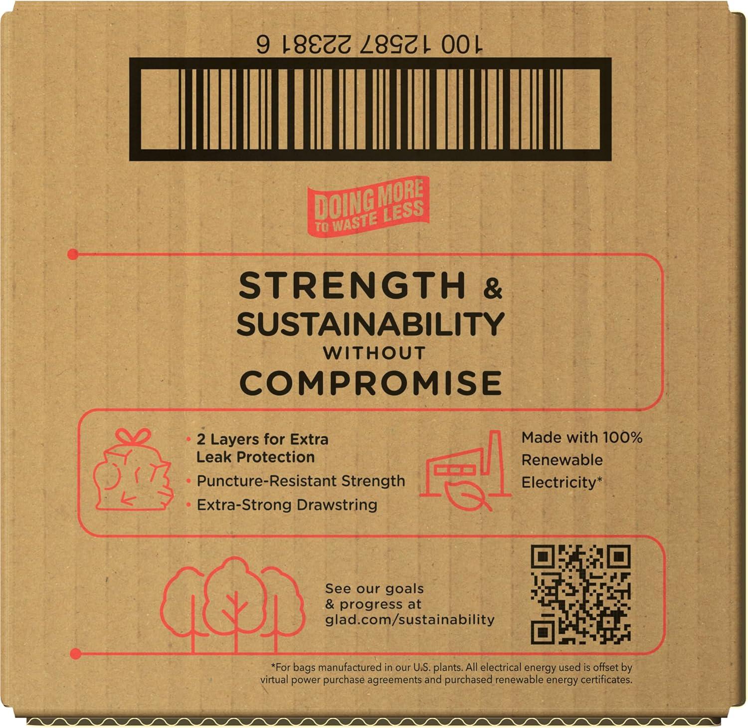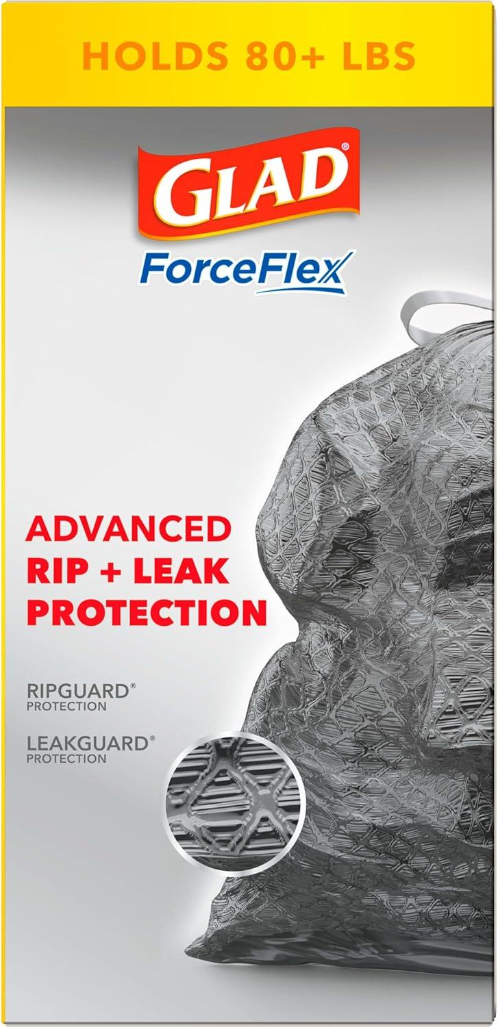 Keep your garbage contained and eliminate trash and bacterial odors with Glad ForceFlex Drawstring Large Trash Bags with the odor-fighting power of Clorox. Featuring the clean scent of Mountain Air, these scented garbage bags help keep your space smelling fresh. With stretchable strength and advanced RipGuard and LeakGuard protection, these heavy-duty ForceFlex trash bags resist punctures, rips, tears and the seepage of liquids. Each bag holds 80+ pounds to handle your biggest trash loads without messy trash disasters. The sturdy drawstring grips the trash can to keep the large black trash bags in place, and it closes with a quick cinch when the garbage bag is full. Once closed, the drawstring keeps the trash securely inside the bag, letting you confidently transport it to the curb without frustration or fear of leaks and tears. Each of these scented trash bags measures 2 feet 6 inches by 2 feet 8 inches, making it just the right size for large outdoor garbage cans. Use these drawstring trash bags for any large project, whether you're moving, cleaning out the garage or tackling a demanding outdoor cleanup job. It's better than all good. Its all Glad.