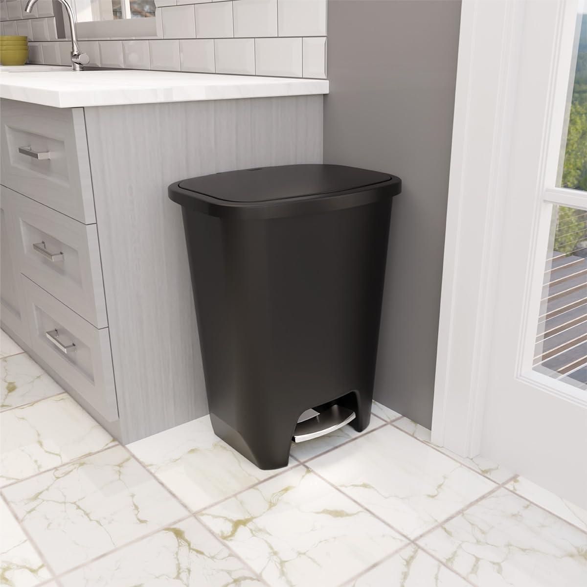 KITCHEN TRASH CAN WITH UPGRADED STEP PEDAL – The Glad plastic trash can has been redesigned with a premium stainless steel foot pedal for exceptional strength and lasting use, while the hands-free operation allows you to throw your trash without having to lift the lid of the can.