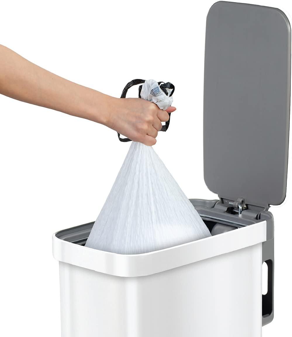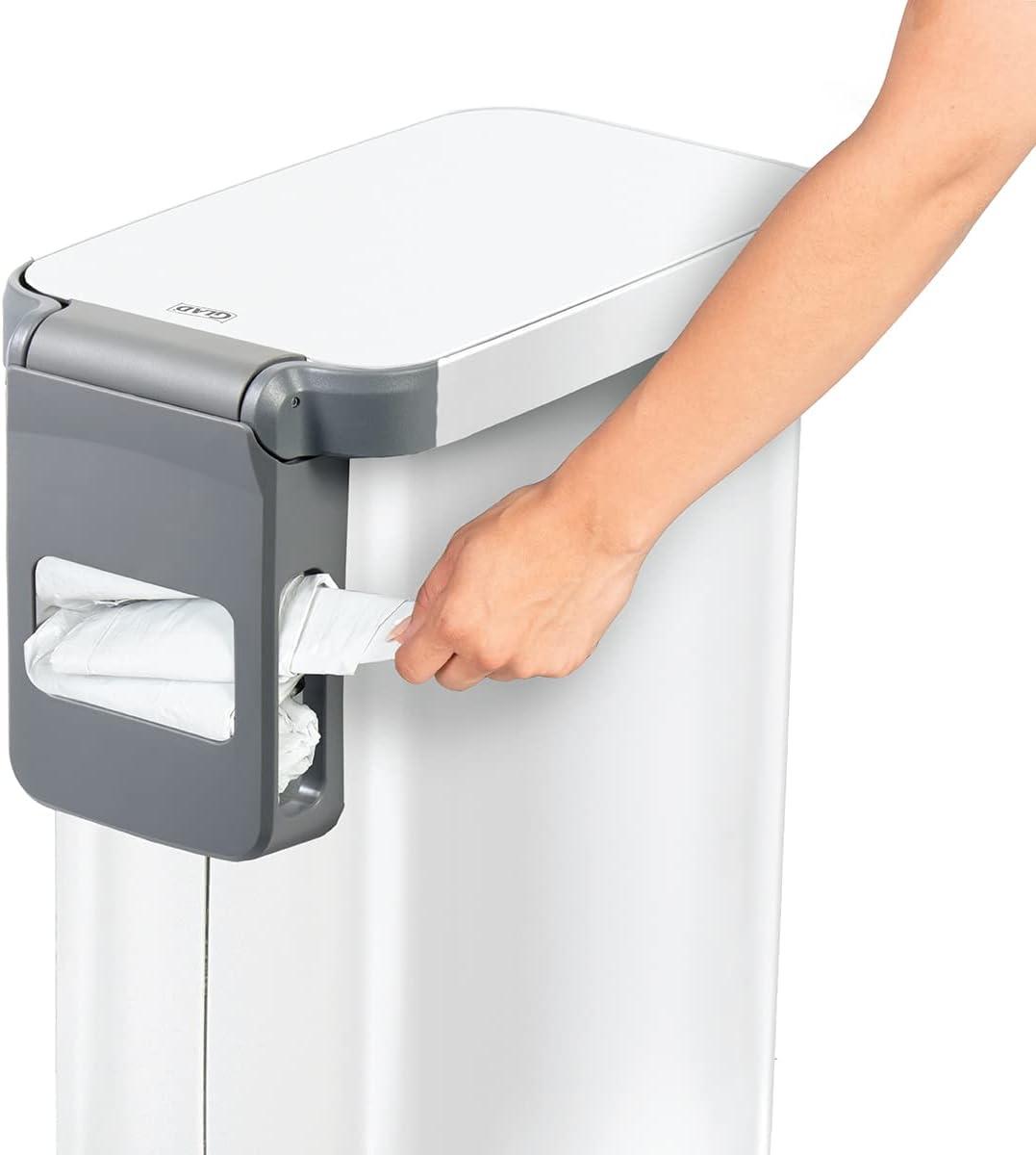 TRASH BAG HOLDER & DISPENSER – Use the waste bag compartment located on the back of the can for convenient storage of extra garbage bags. Simply load your 13 gallon trash bags into the top and dispense from the side.