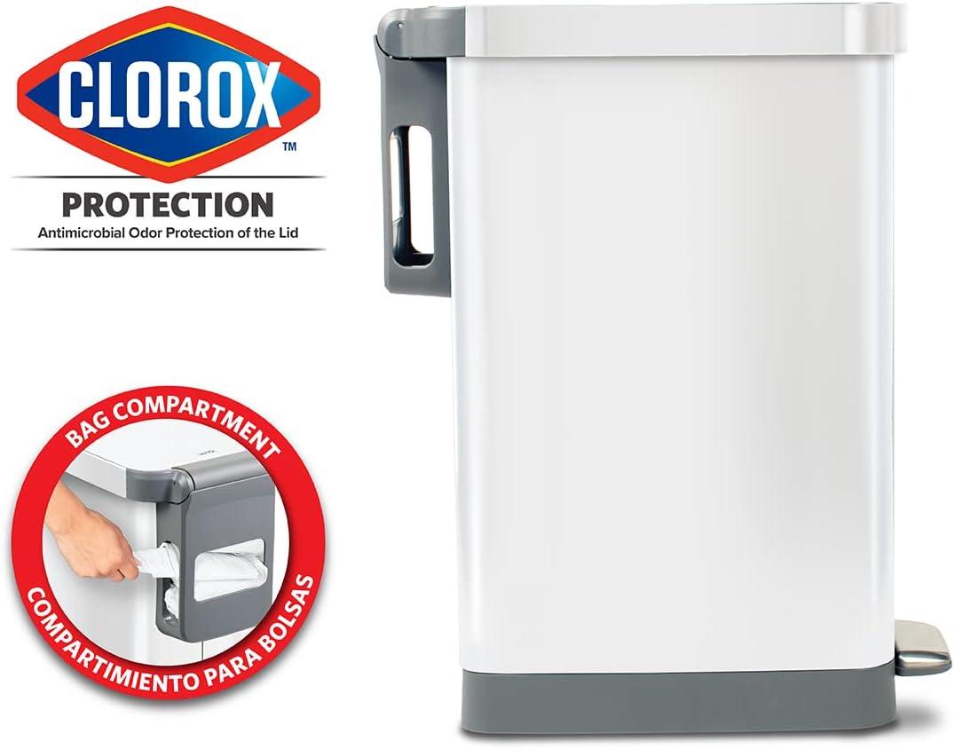 Glad Slim Trash Can with Clorox Odor Protection – Narrow Kitchen Garbage Bin with Soft Close Lid, Step On Foot Pedal and Waste Bag Roll Holder, White Stainless Steel, 45 Liter