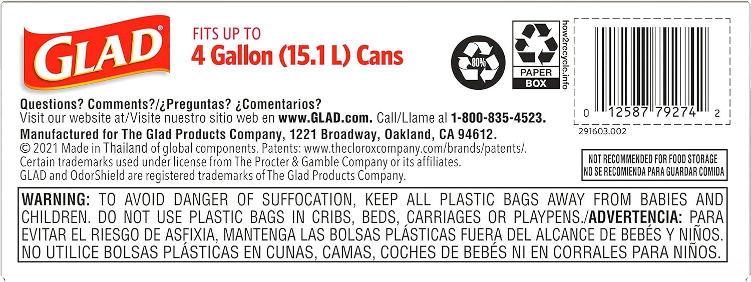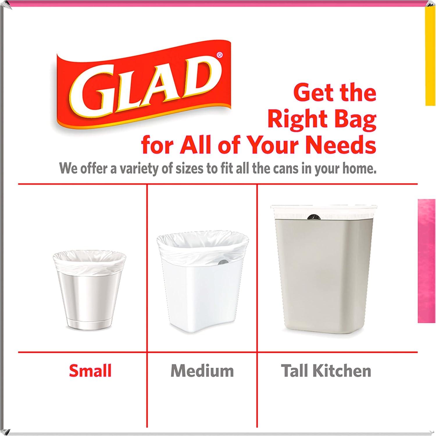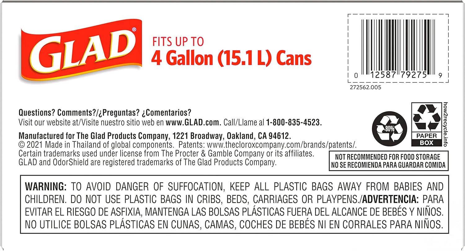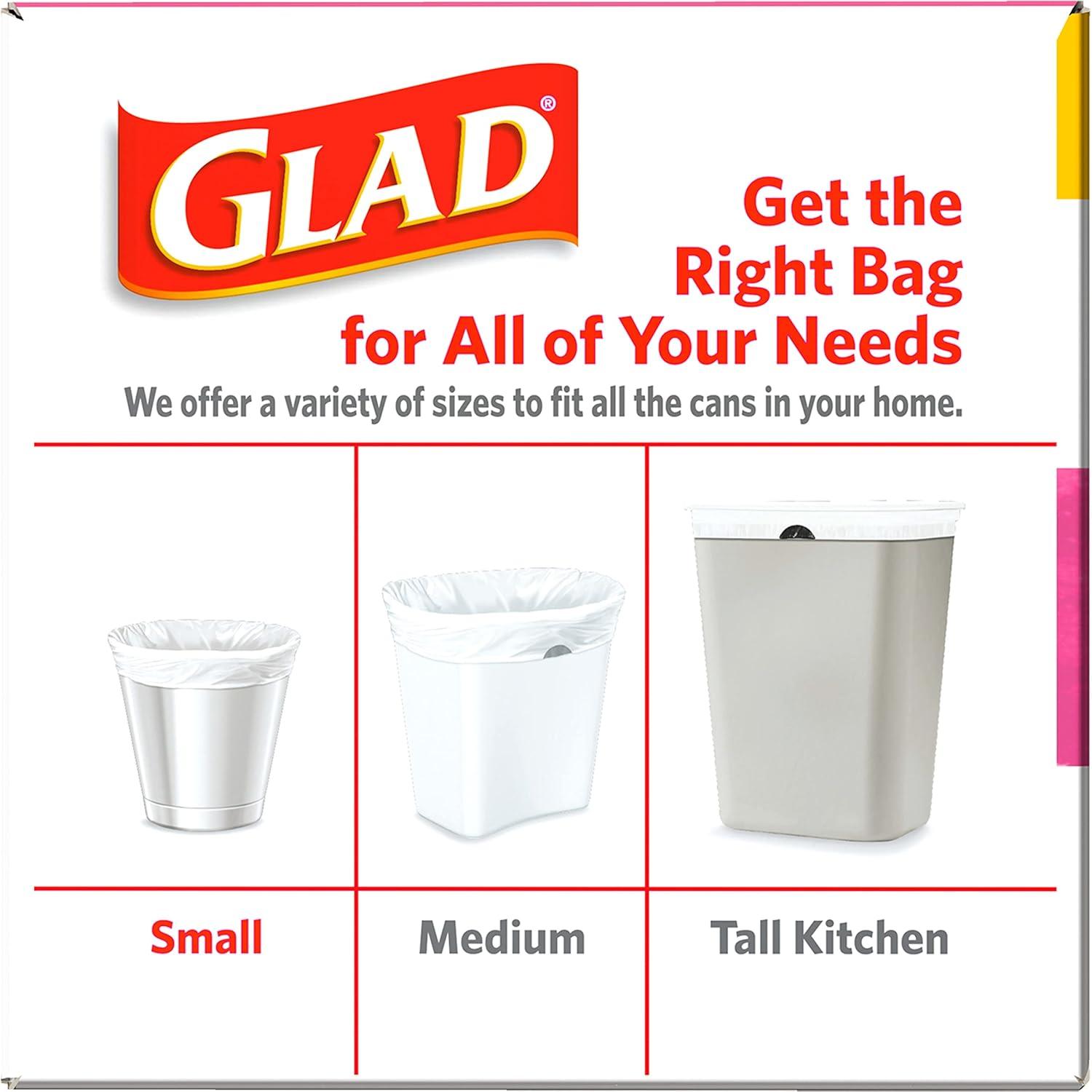 4 GALLON TRASH BAGS: Each of these Glad trash bags measures 17 inches by 18 inches, making it just the right size for small garbage cans