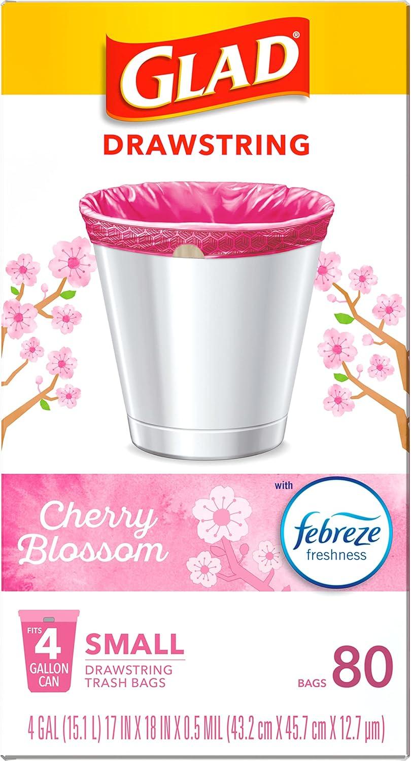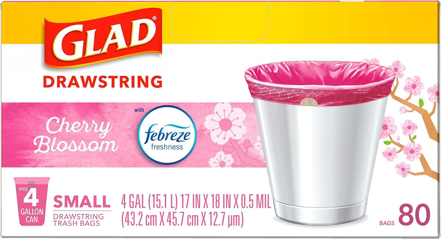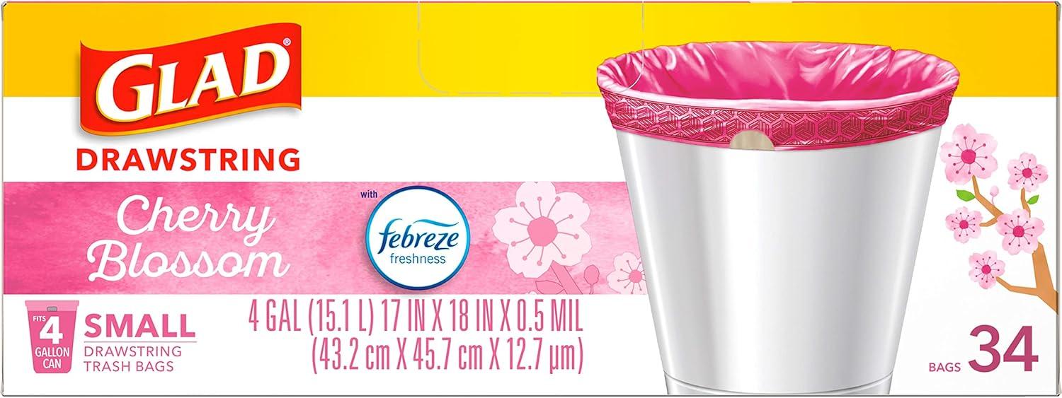 Glad Drawstring Small Trash Bags With Clorox eliminate bacterial odors on the garbage bag to help keep your home feeling clean and healthy. Featuring a Lemon Fresh Bleach Scent, these strong and sturdy 4 gallon trash bags combine the strength of Glad with the odor-fighting power of Clorox for a dynamic partnership you can trust. Each of these small garbage bags features a durable drawstring that makes the garbage bag easy to close with a quick cinch. Once closed, the drawstring keeps the trash securely inside the bag, letting you transport it to your outdoor garbage can frustration-free without fear of leaks and tears. Each bag measures 17 inches by 18 inches, making it just the right size for most small garbage cans. Stock your bedroom, nursery and even your vehicle with these handy small bathroom trash bags. Take control of trash with Glad, and protect your home from garbage disasters. It's better than all good. It's all Glad.