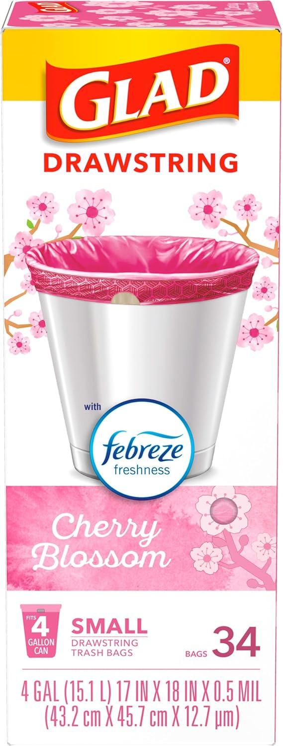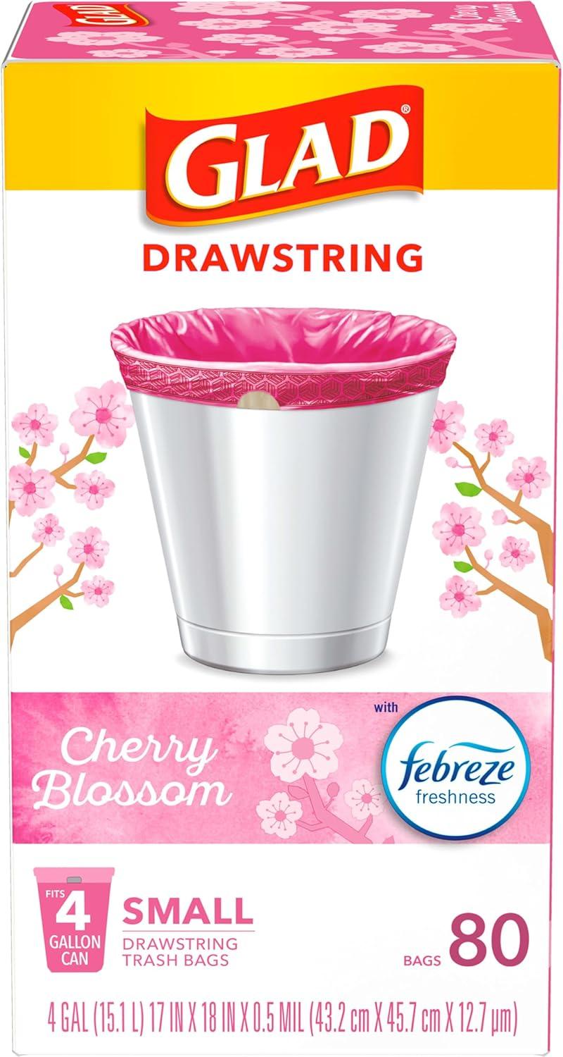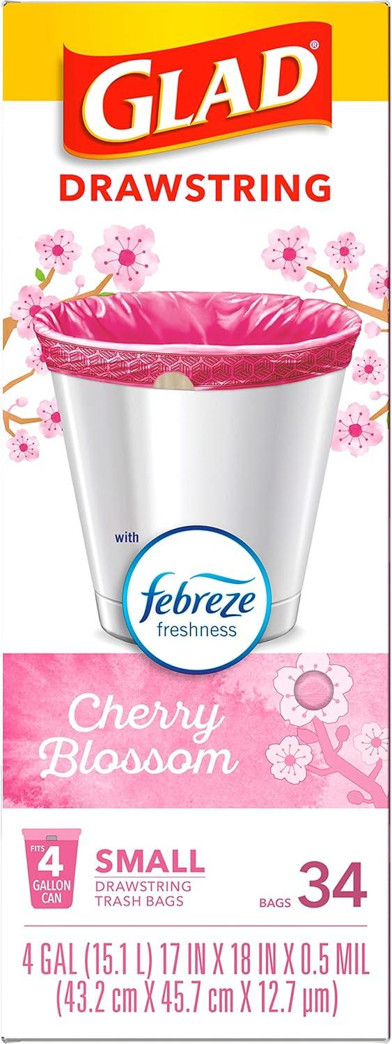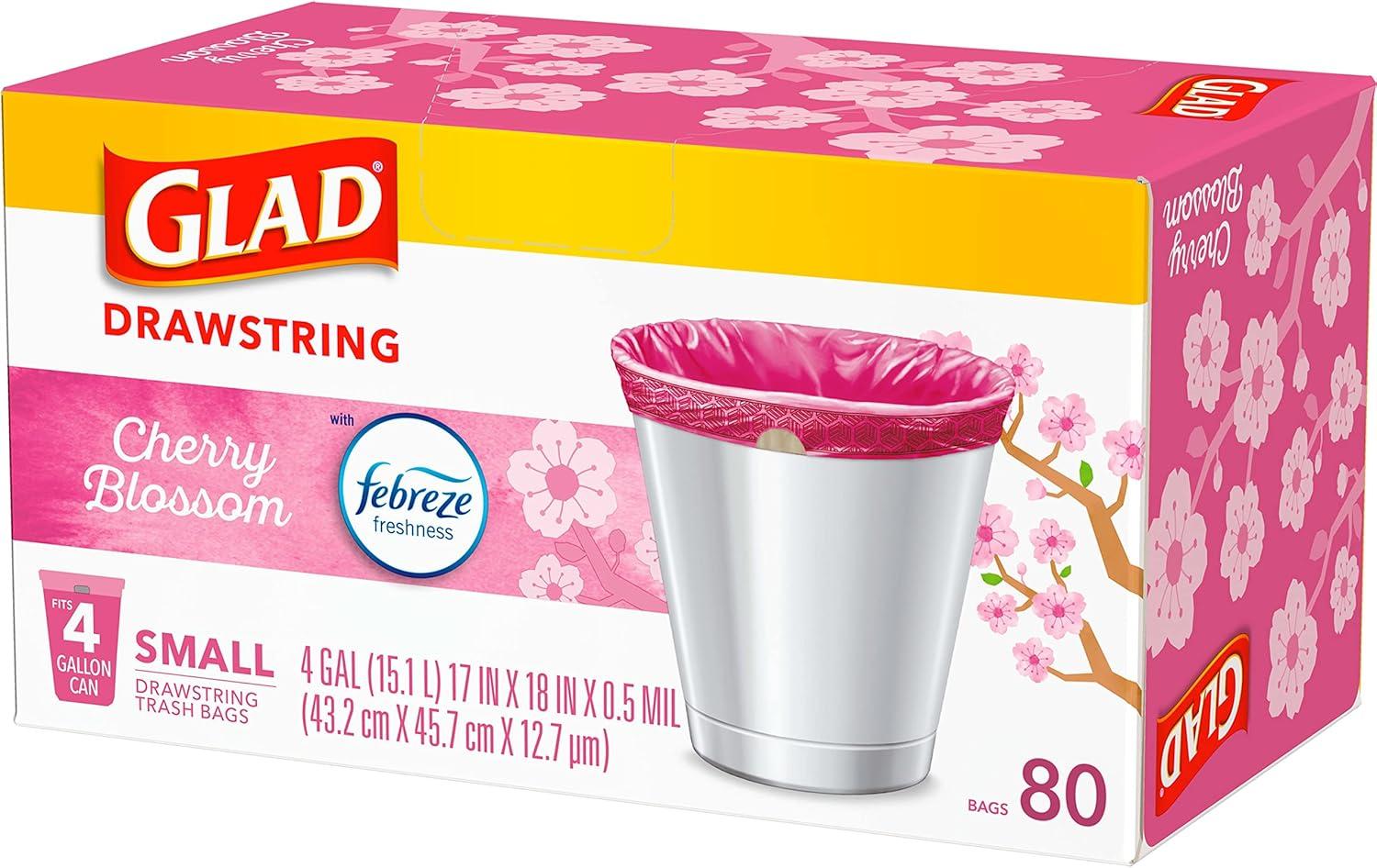 Glad Drawstring Small Trash Bags With Clorox eliminate bacterial odors on the garbage bag to help keep your home feeling clean and healthy. Featuring a Lemon Fresh Bleach Scent, these strong and sturdy 4 gallon trash bags combine the strength of Glad with the odor-fighting power of Clorox for a dynamic partnership you can trust. Each of these small garbage bags features a durable drawstring that makes the garbage bag easy to close with a quick cinch. Once closed, the drawstring keeps the trash securely inside the bag, letting you transport it to your outdoor garbage can frustration-free without fear of leaks and tears. Each bag measures 17 inches by 18 inches, making it just the right size for most small garbage cans. Stock your bedroom, nursery and even your vehicle with these handy small bathroom trash bags. Take control of trash with Glad, and protect your home from garbage disasters. It's better than all good. It's all Glad.