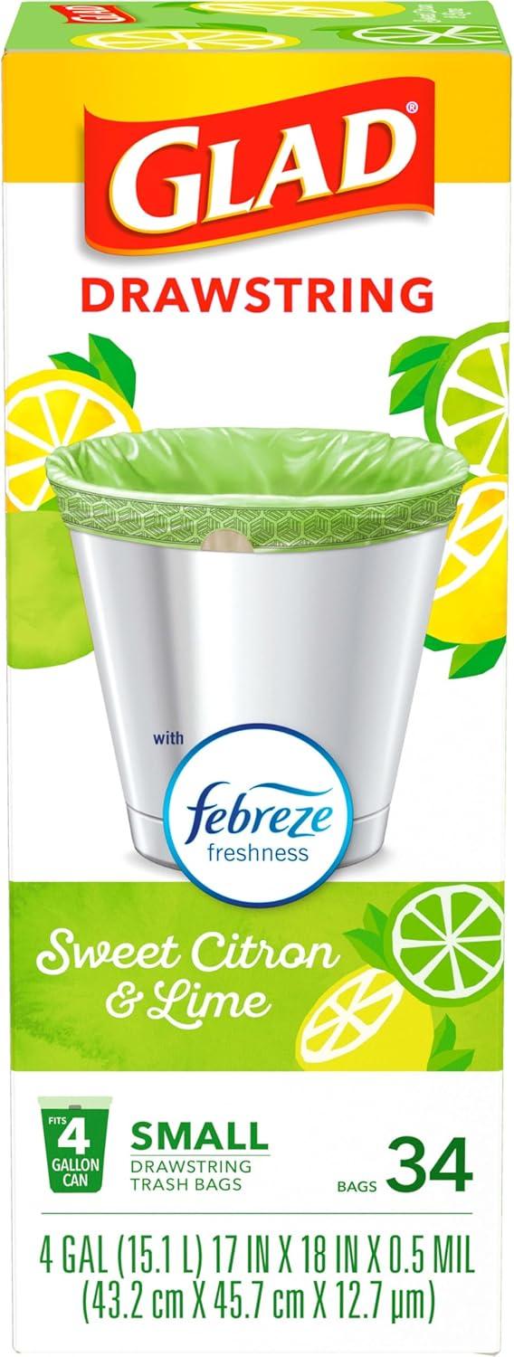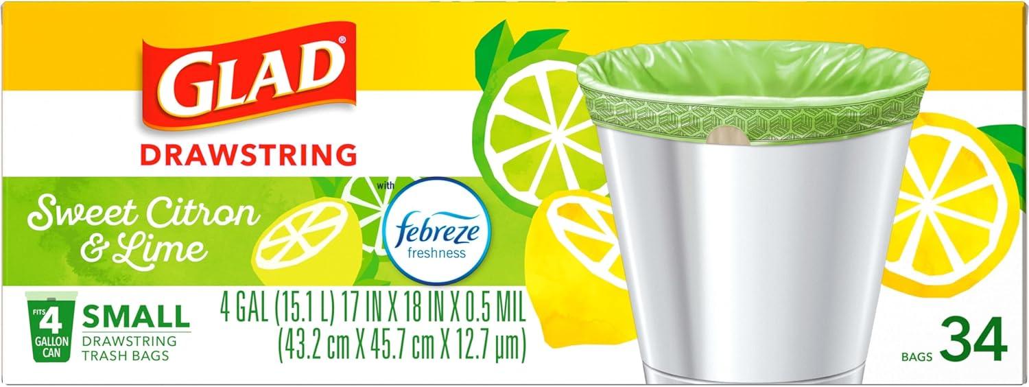 Glad Drawstring Small Trash Bags With Clorox eliminate bacterial odors on the garbage bag to help keep your home feeling clean and healthy. Featuring a Lemon Fresh Bleach Scent, these strong and sturdy 4 gallon trash bags combine the strength of Glad with the odor-fighting power of Clorox for a dynamic partnership you can trust. Each of these small garbage bags features a durable drawstring that makes the garbage bag easy to close with a quick cinch. Once closed, the drawstring keeps the trash securely inside the bag, letting you transport it to your outdoor garbage can frustration-free without fear of leaks and tears. Each bag measures 17 inches by 18 inches, making it just the right size for most small garbage cans. Stock your bedroom, nursery and even your vehicle with these handy small bathroom trash bags. Take control of trash with Glad, and protect your home from garbage disasters. It's better than all good. It's all Glad.