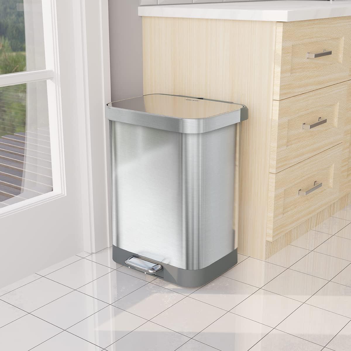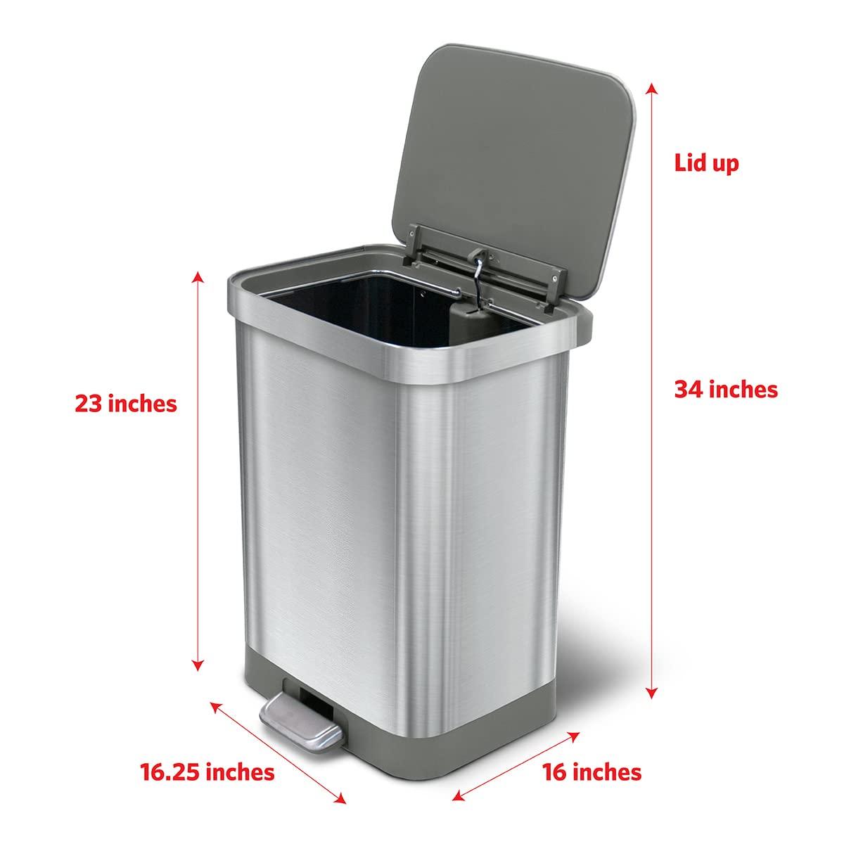 HANDS FREE STEP TRASH CAN WITH SOFT CLOSE LID – For hands-free use, this kitchen trash can is built with an easy step foot pedal. The soft-close lid is specially designed with silent operation for a quiet and controlled open and close every time.