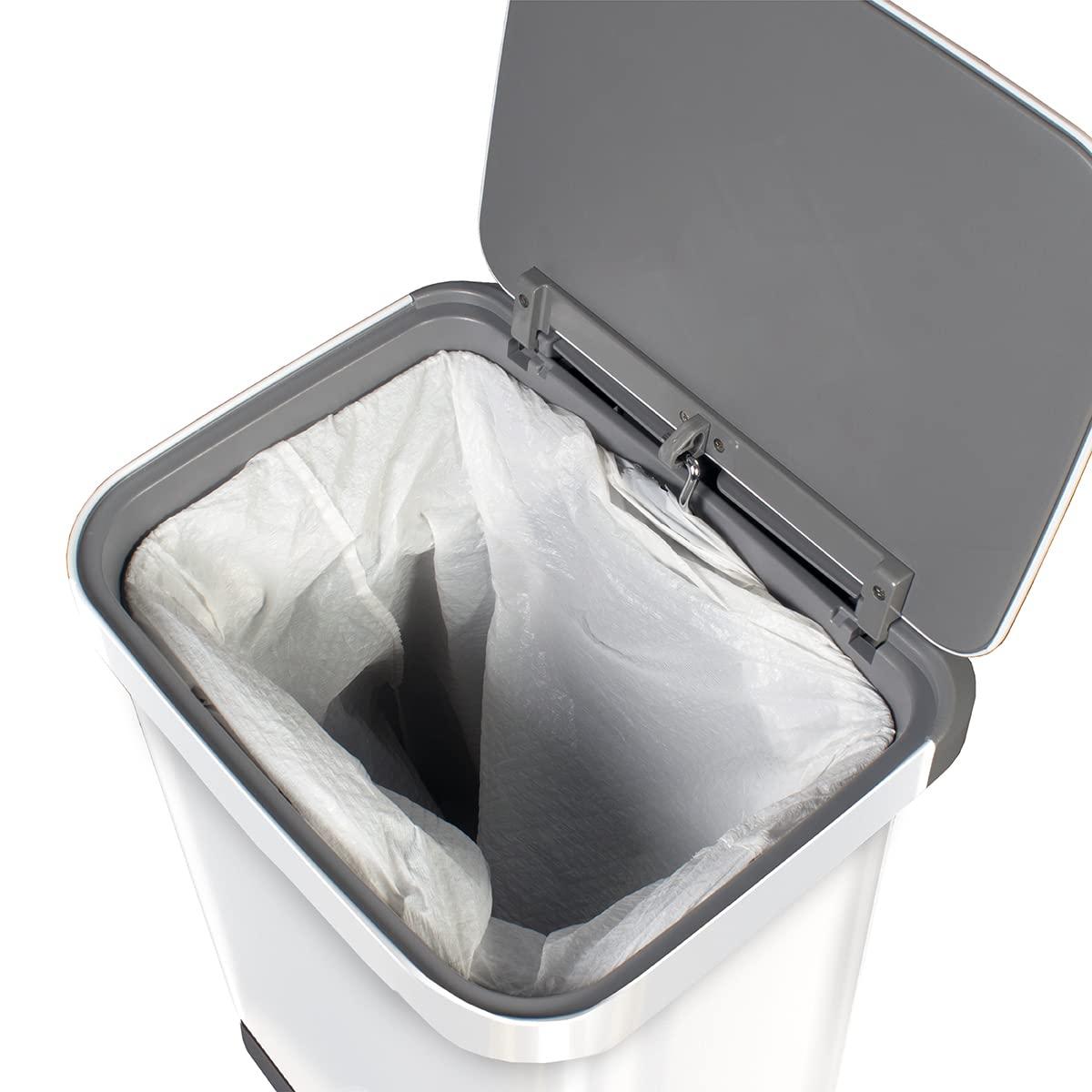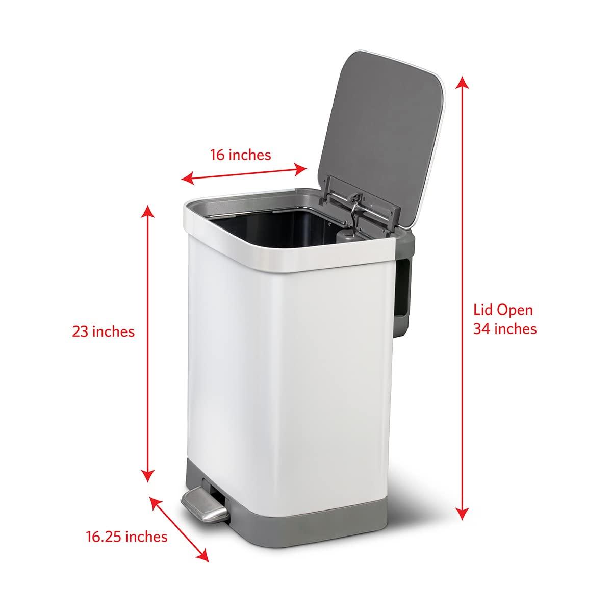 HANDS FREE STEP TRASH CAN WITH SOFT CLOSE LID – For hands-free use, this kitchen trash can is built with an easy step foot pedal. The soft-close lid is specially designed with silent operation for a quiet and controlled open and close every time.