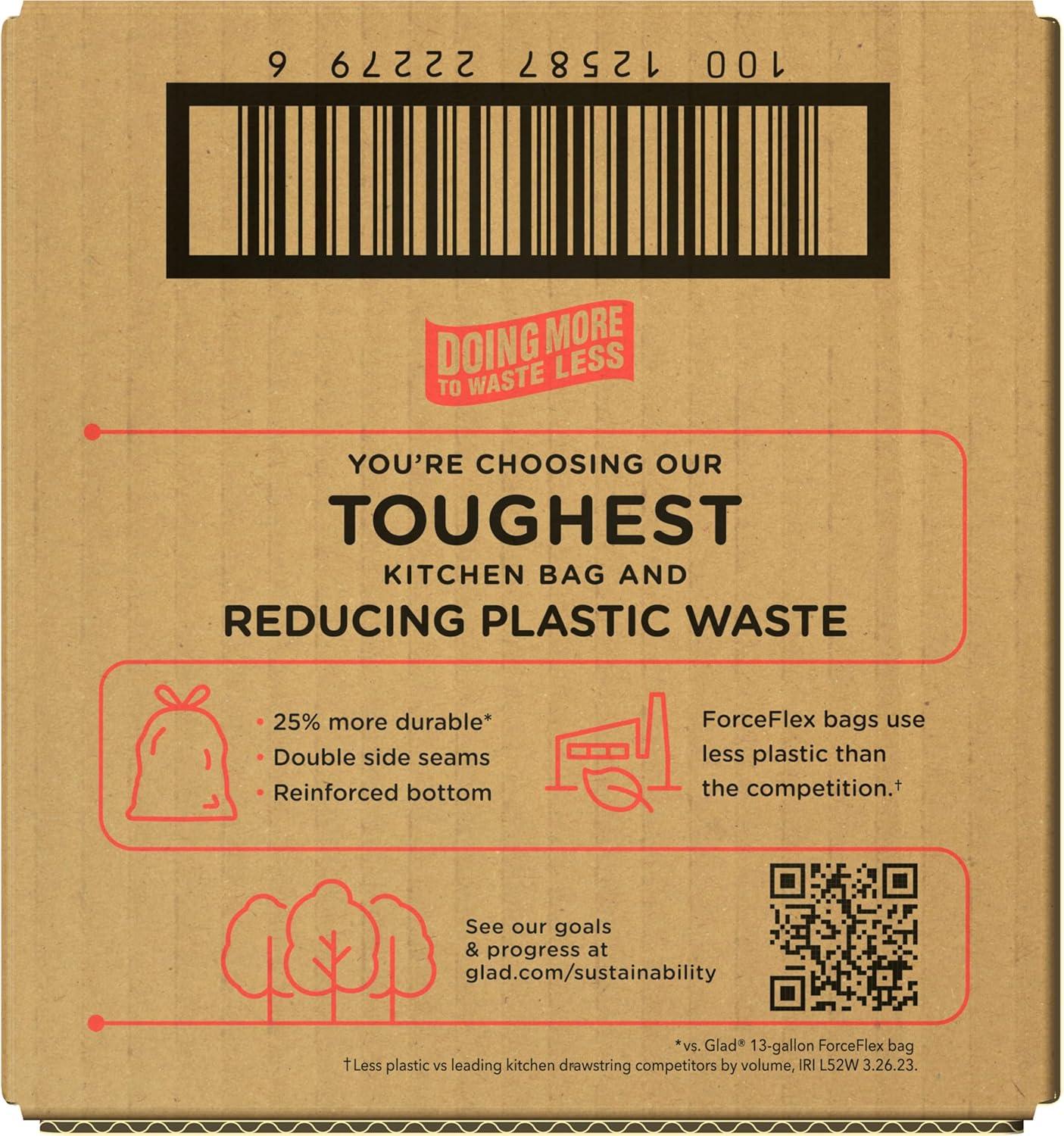 MAXSTRENGTH FORCEFLEX TRASH BAGS: 25% more durable* tall kitchen garbage bags feature an outer leak protection layer and an inner layer that stretches to prevent rips and tears