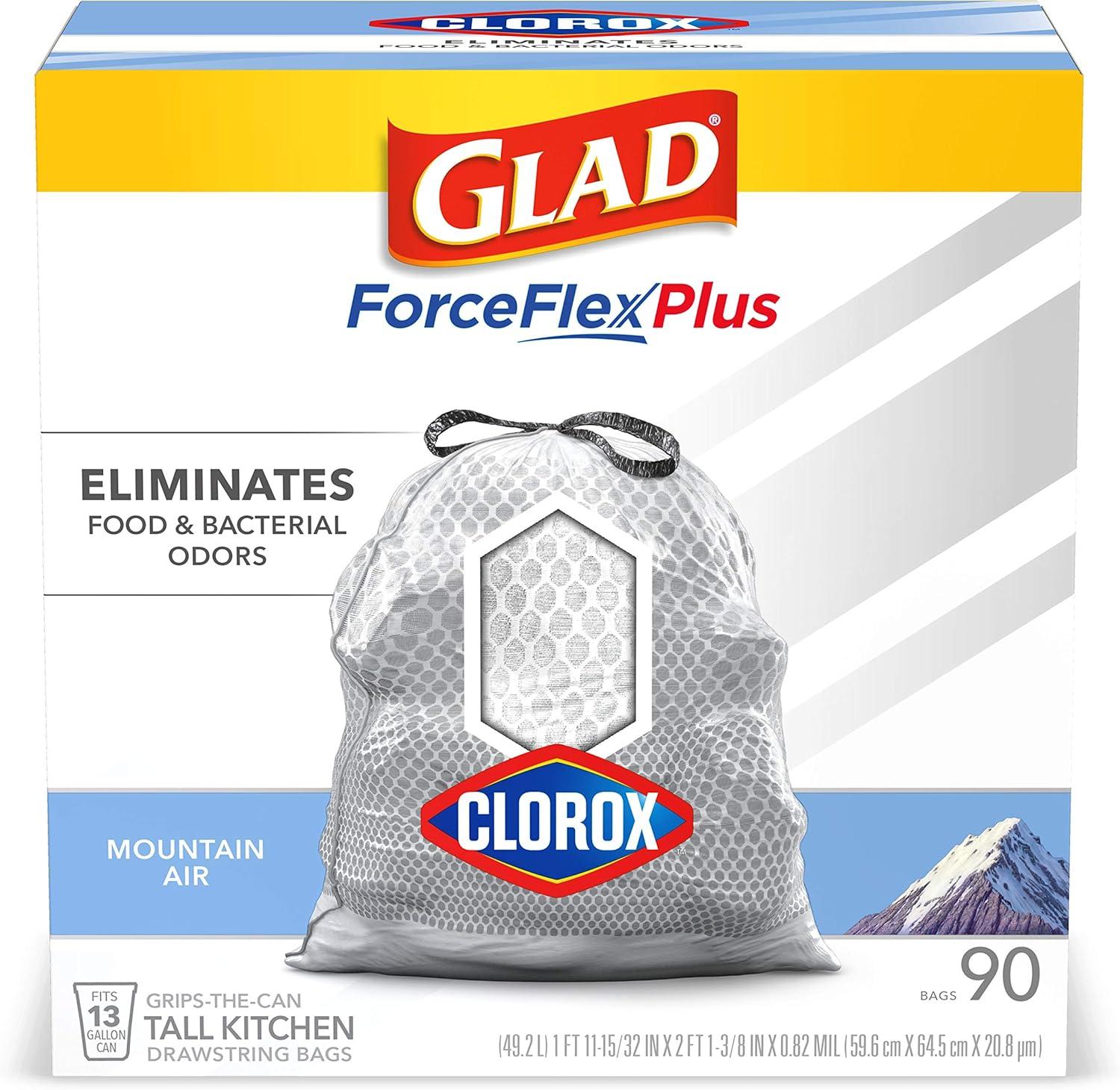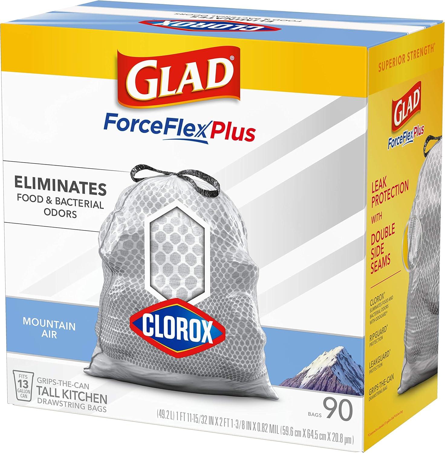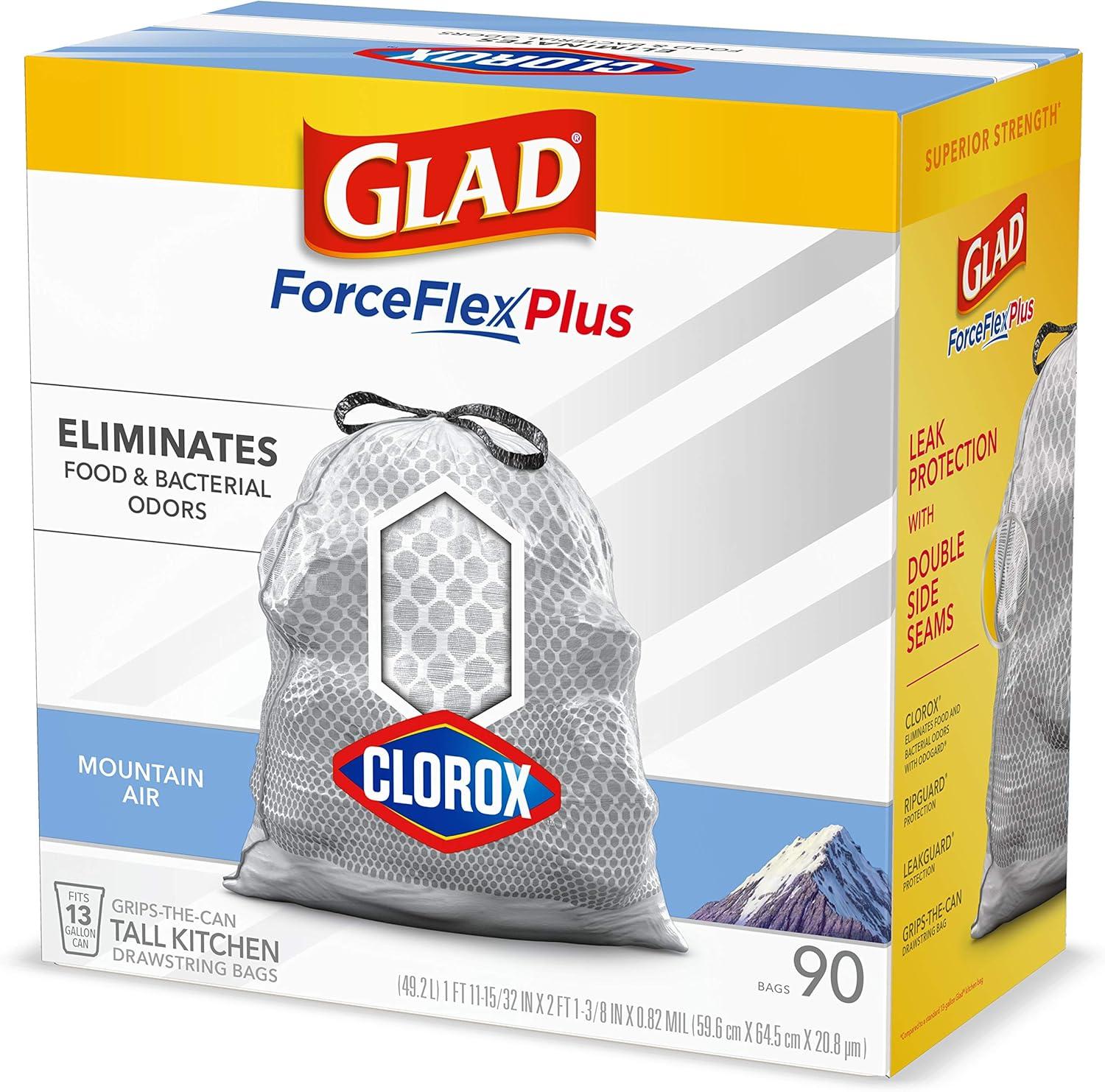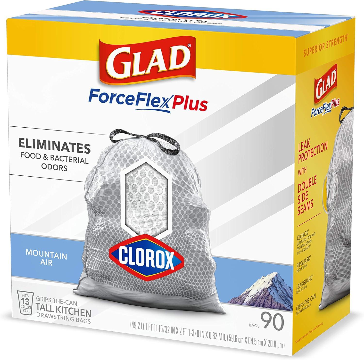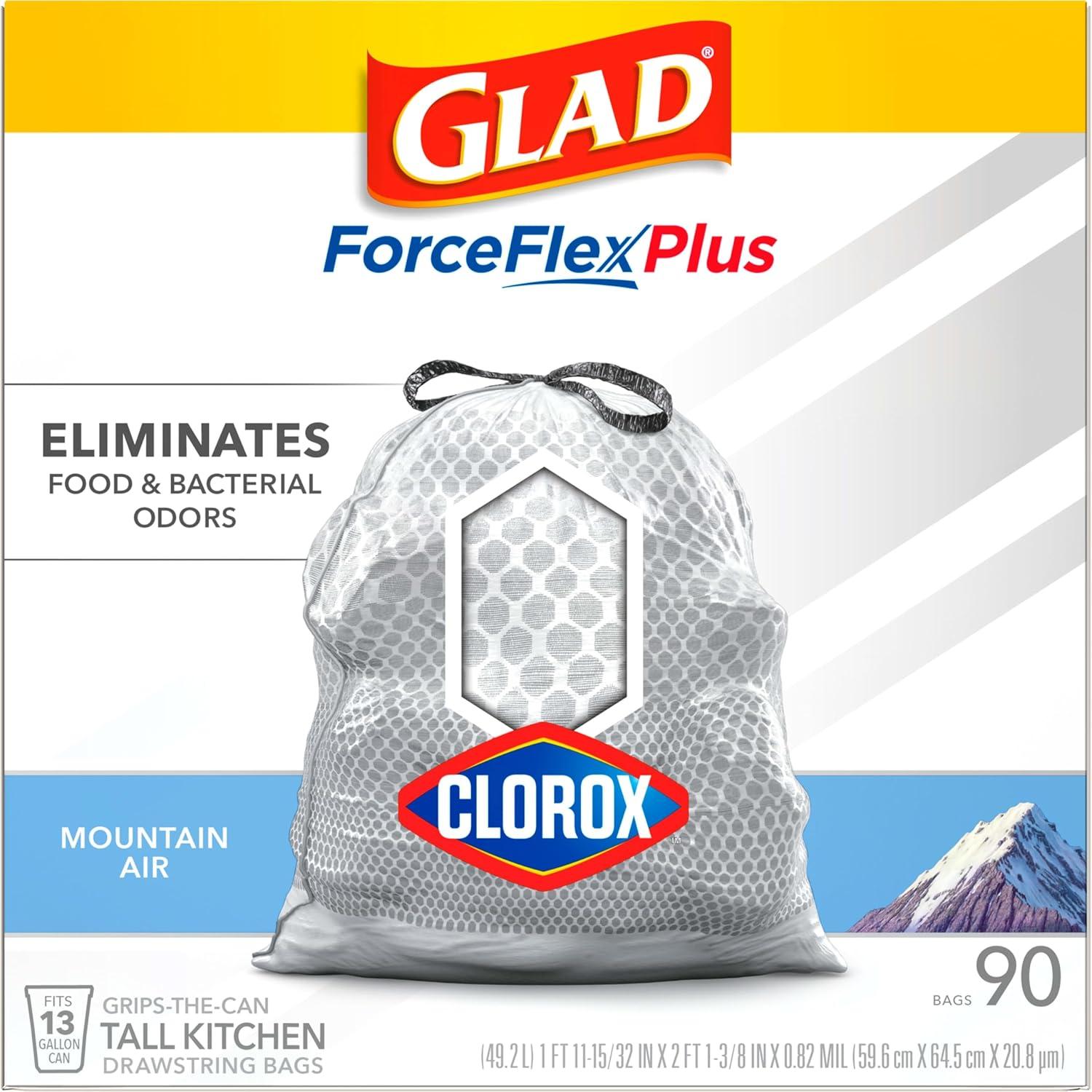 Glad and Clorox have joined forces to create a trash bag with the strength of Glad and the odor-fighting power of Clorox. Glad ForceFlex Plus with Clorox Tall Kitchen Trash Bags eliminate food and bacterial odors to keep your home feeling clean and healthy. These 13 gallon kitchen trash bags are dual layered with a unique hexagon pattern to provide complete protection against your toughest kitchen disasters. The outer layer is equipped with LeakGuard and double side seams for added leak protection, while the inner RipGuard layer stretches to prevent rips and tears with the trusted stretchable strength of Glads ForceFlex Plus technology. These versatile garbage bags feature the clean and gentle scent of Mountain Air and are ideal for use in the kitchen or for spring cleaning. The drawstring grips to the trash can, keeping the bag in place until you're ready to take it out. Just a quick cinch of the durable drawstring makes trash removal simple.