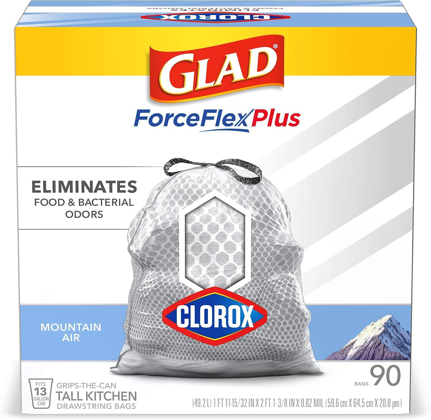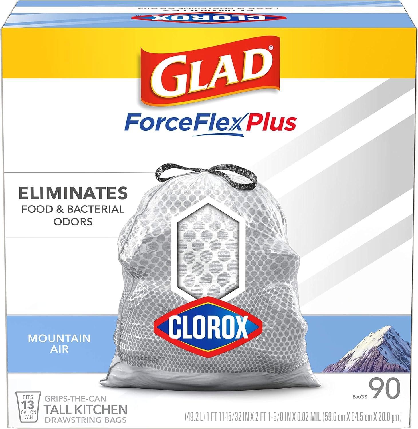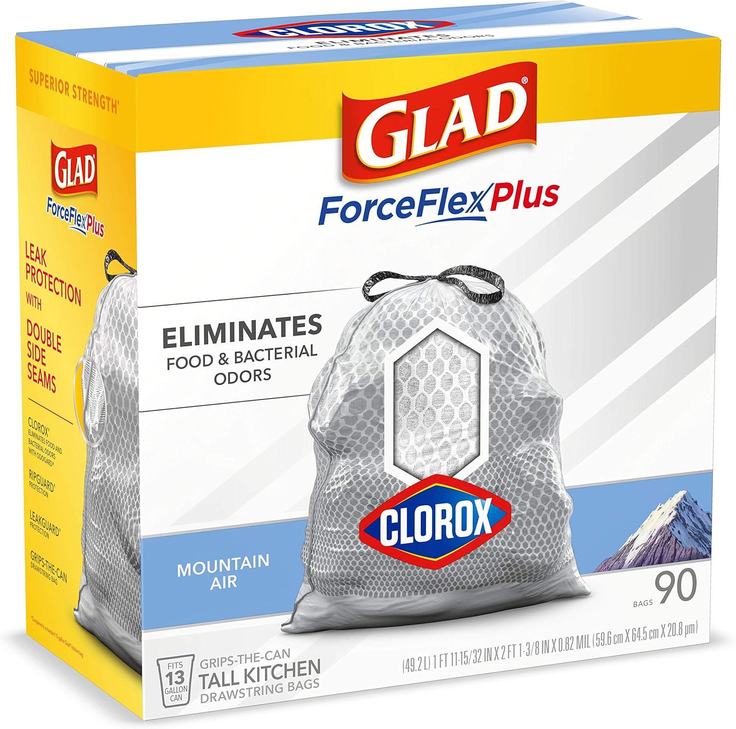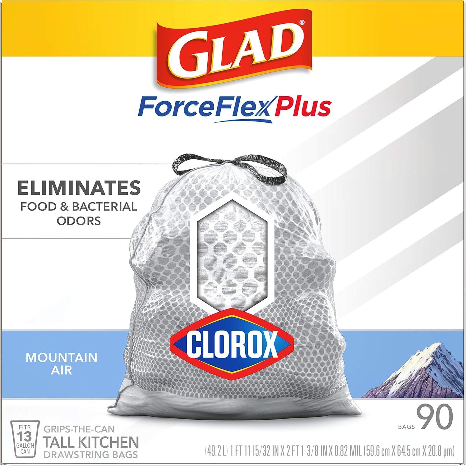 Glad and Clorox have joined forces to create a trash bag with the strength of Glad and the odor-fighting power of Clorox. Glad ForceFlex Plus with Clorox Tall Kitchen Trash Bags eliminate food and bacterial odors to keep your home feeling clean and healthy. These 13 gallon kitchen trash bags are dual layered with a unique hexagon pattern to provide complete protection against your toughest kitchen disasters. The outer layer is equipped with LeakGuard and double side seams for added leak protection, while the inner RipGuard layer stretches to prevent rips and tears with the trusted stretchable strength of Glads ForceFlex Plus technology. These versatile garbage bags feature the clean and gentle scent of Mountain Air and are ideal for use in the kitchen or for spring cleaning. The drawstring grips to the trash can, keeping the bag in place until you're ready to take it out. Just a quick cinch of the durable drawstring makes trash removal simple.