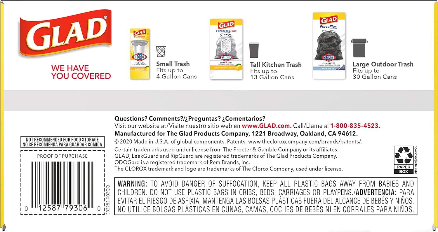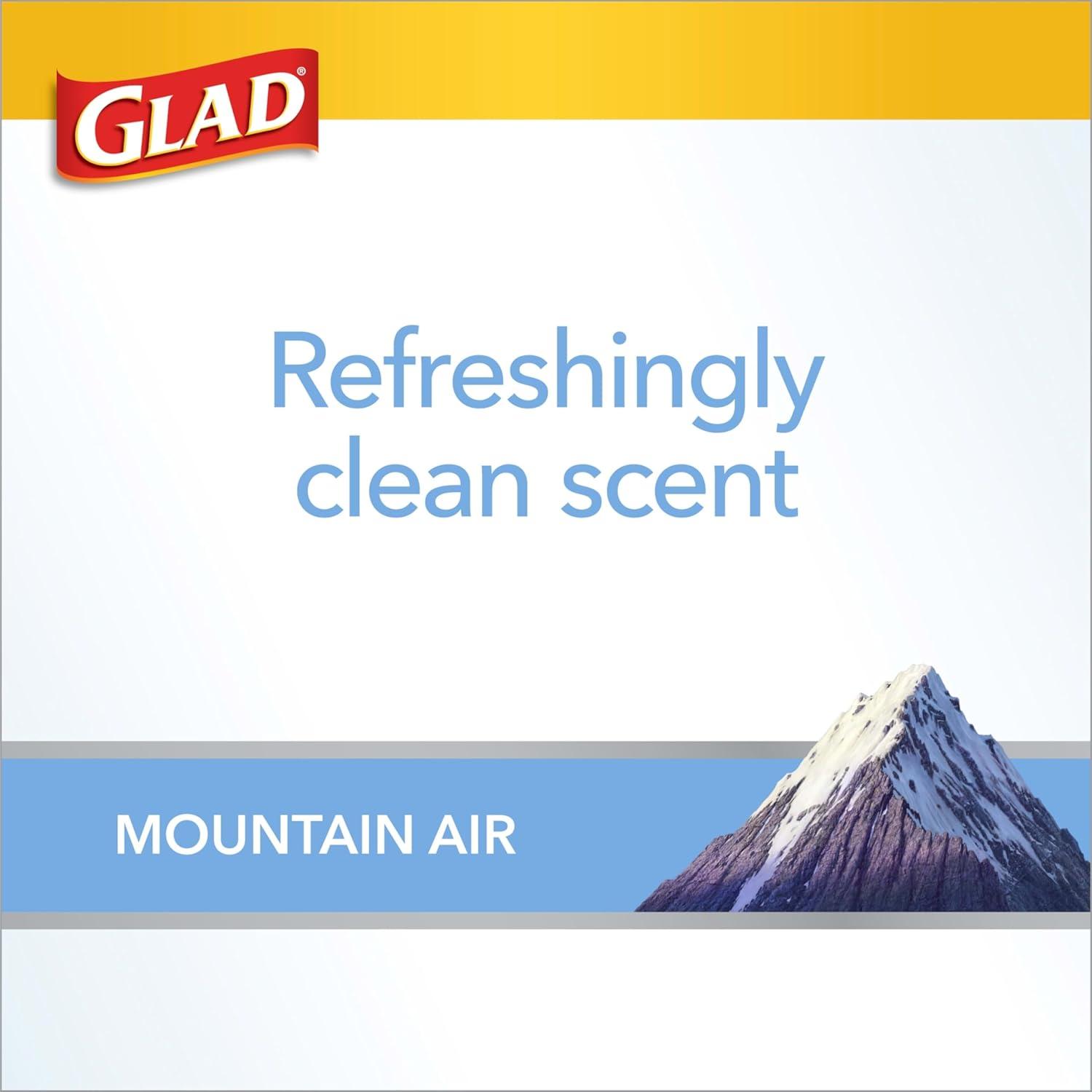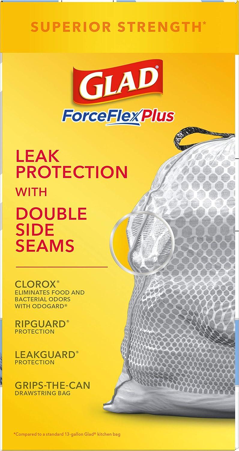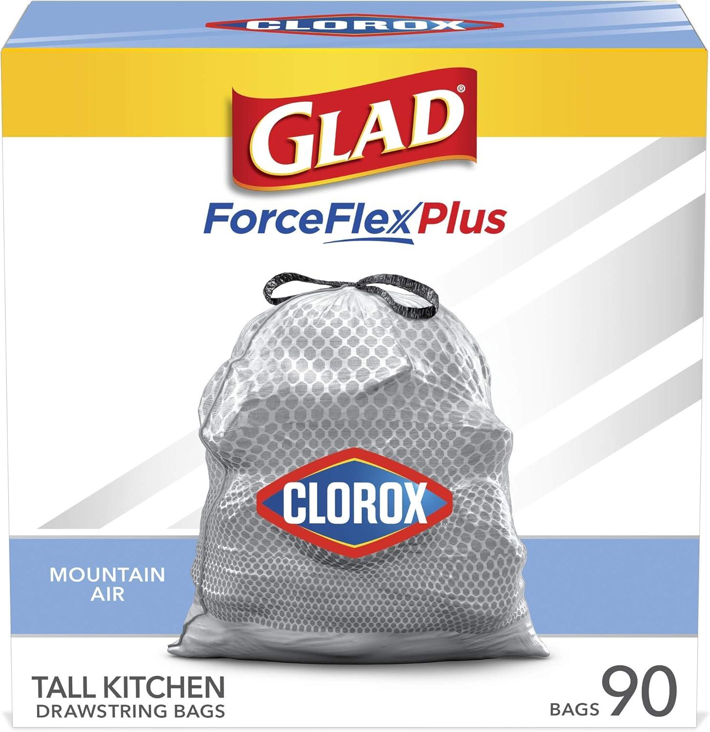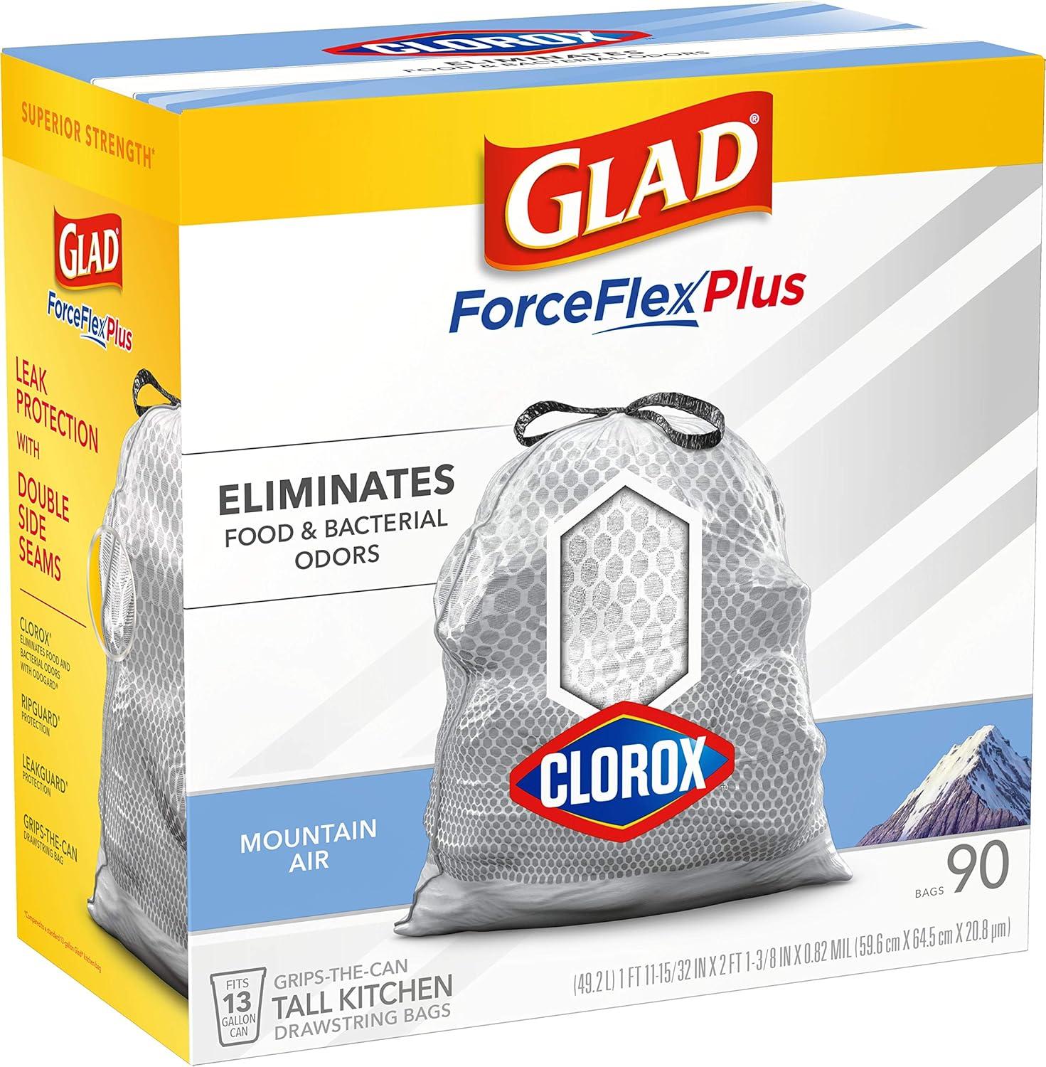 Glad and Clorox have joined forces to create a trash bag with the strength of Glad and the odor-fighting power of Clorox. Glad ForceFlex Plus with Clorox Tall Kitchen Trash Bags eliminate food and bacterial odors to keep your home feeling clean and healthy. These 13 gallon kitchen trash bags are dual layered with a unique hexagon pattern to provide complete protection against your toughest kitchen disasters. The outer layer is equipped with LeakGuard and double side seams for added leak protection, while the inner RipGuard layer stretches to prevent rips and tears with the trusted stretchable strength of Glads ForceFlex Plus technology. These versatile garbage bags feature the clean and gentle scent of Mountain Air and are ideal for use in the kitchen or for spring cleaning. The drawstring grips to the trash can, keeping the bag in place until you're ready to take it out. Just a quick cinch of the durable drawstring makes trash removal simple.