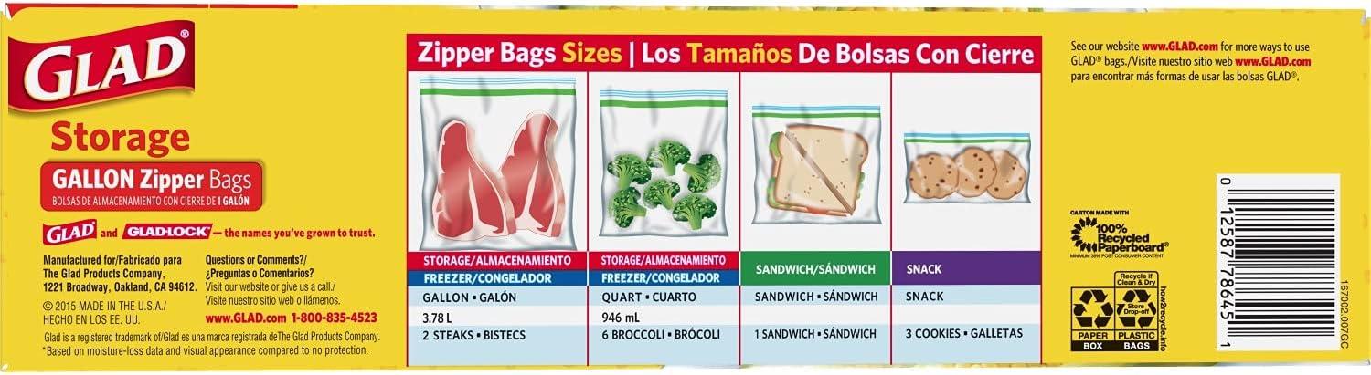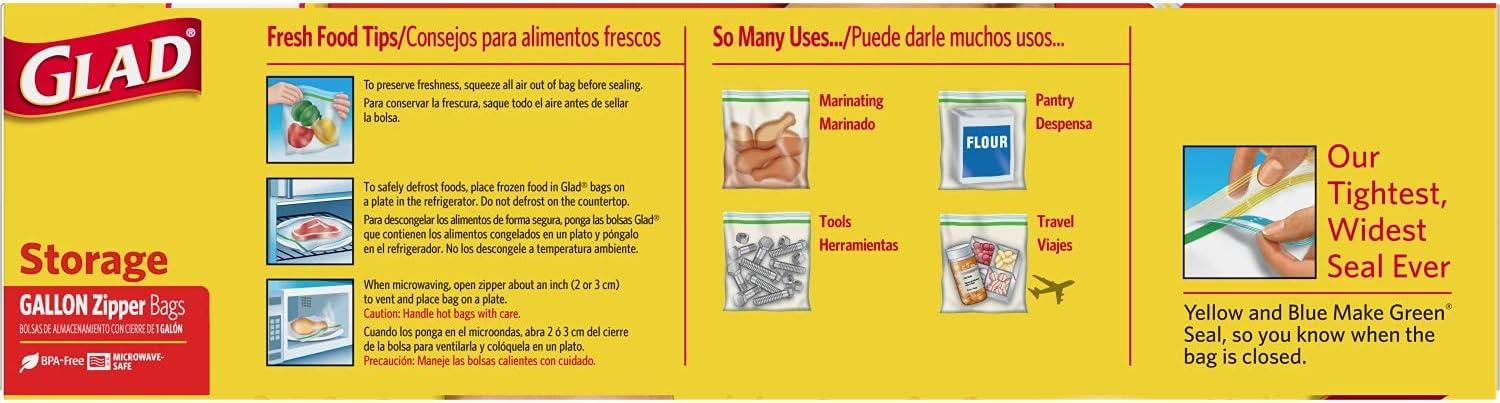 MULTIPURPOSE STORAGE BAGS: Glad gallon zip seal bags are ideal for storing food before and after preparation, marinating meat or use as a reusable plastic bag to pack and organize items while traveling or on the go