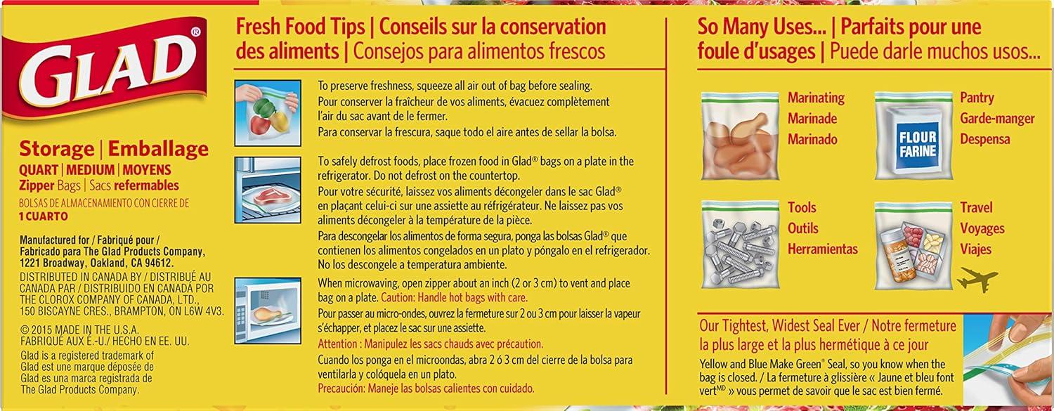 MULTIPURPOSE STORAGE BAGS: Glad quart zip seal bags are ideal for storing food before and after preparation, marinating meat or use as a reusable plastic bag to pack and organize items while traveling or on the go